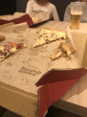 Пицца огромная, брали 2 Венеция и ташир. Сочная, начинки не пожалели. Не успела сфоткать, какие сразу они были.