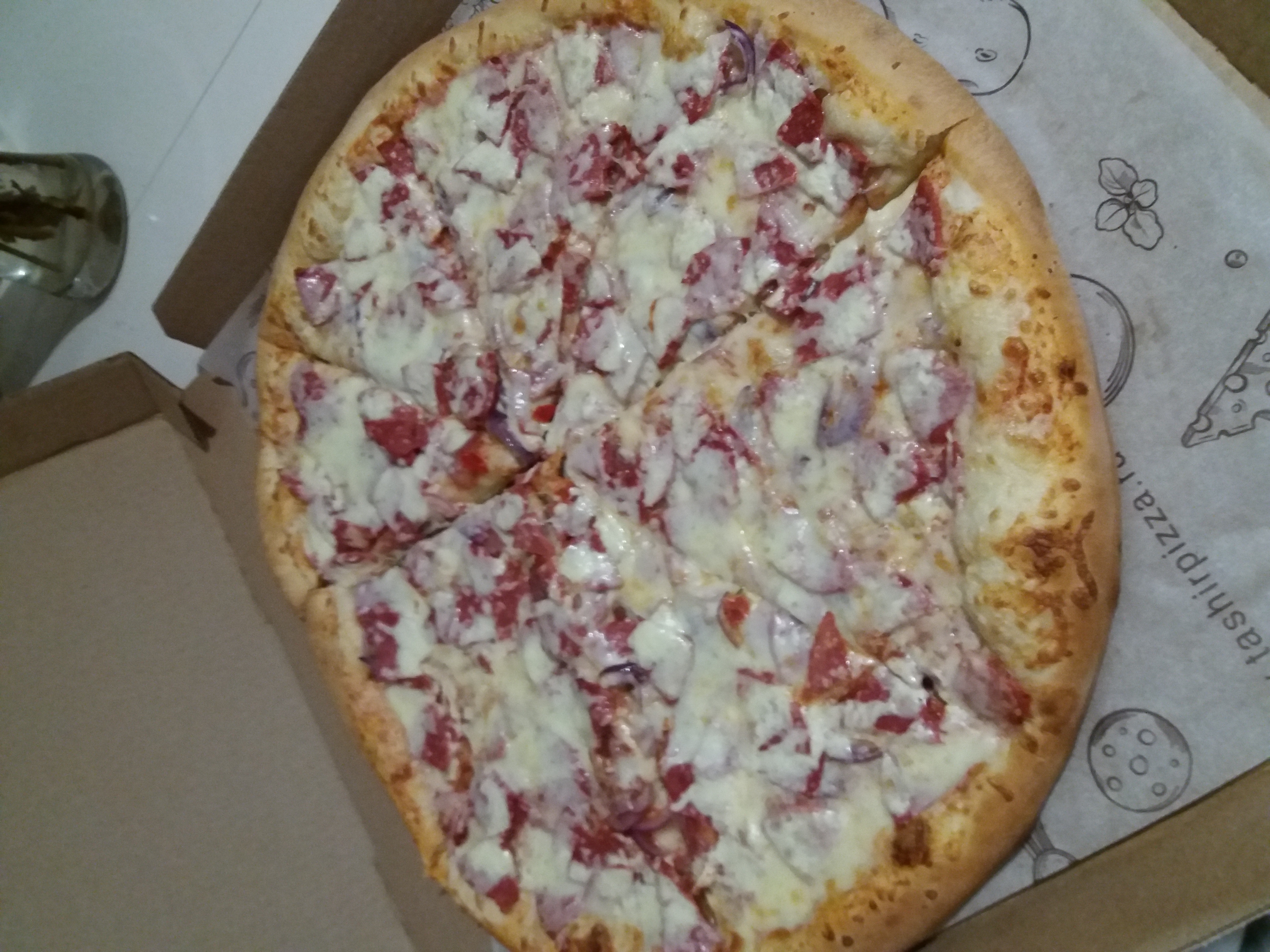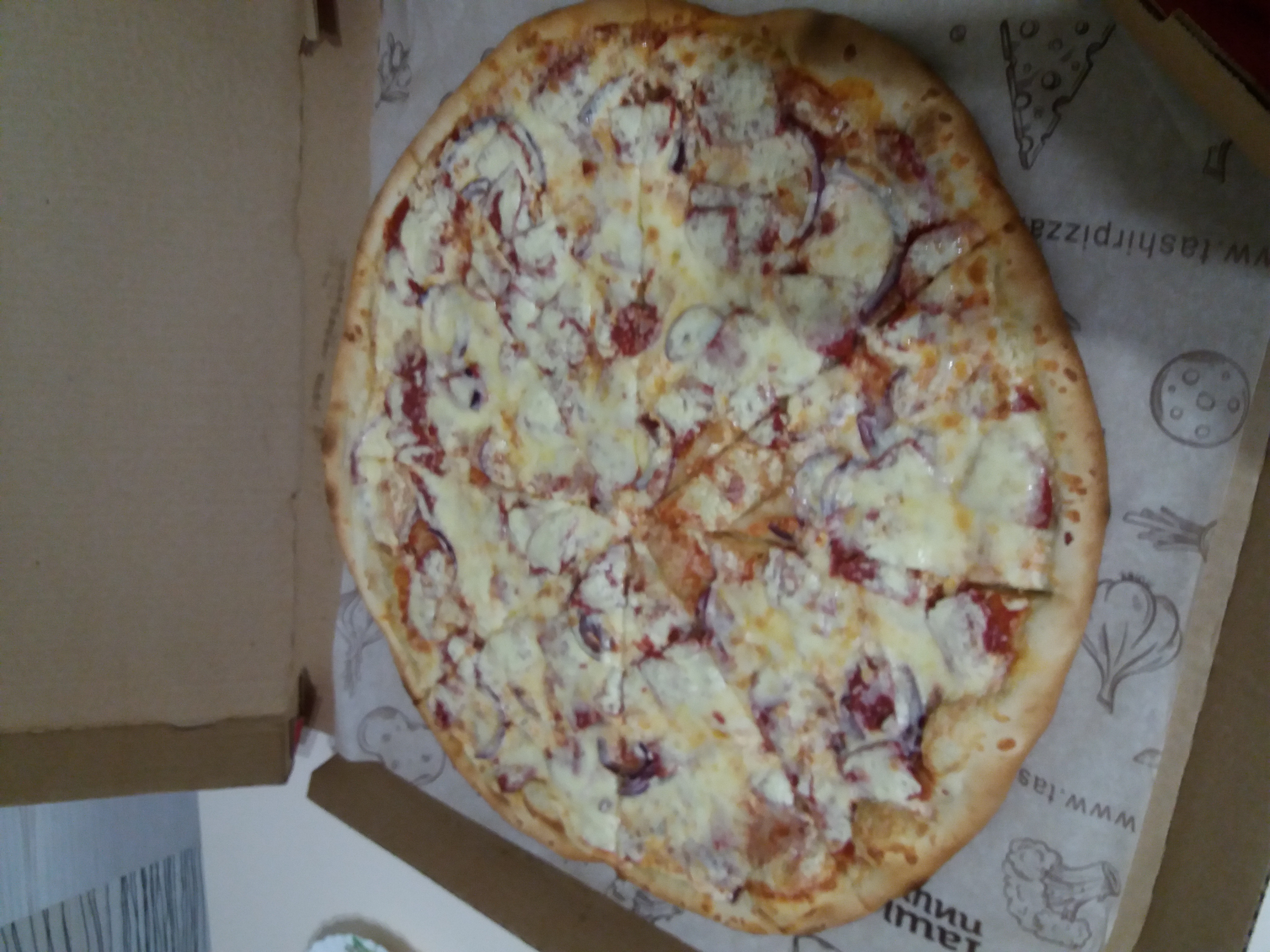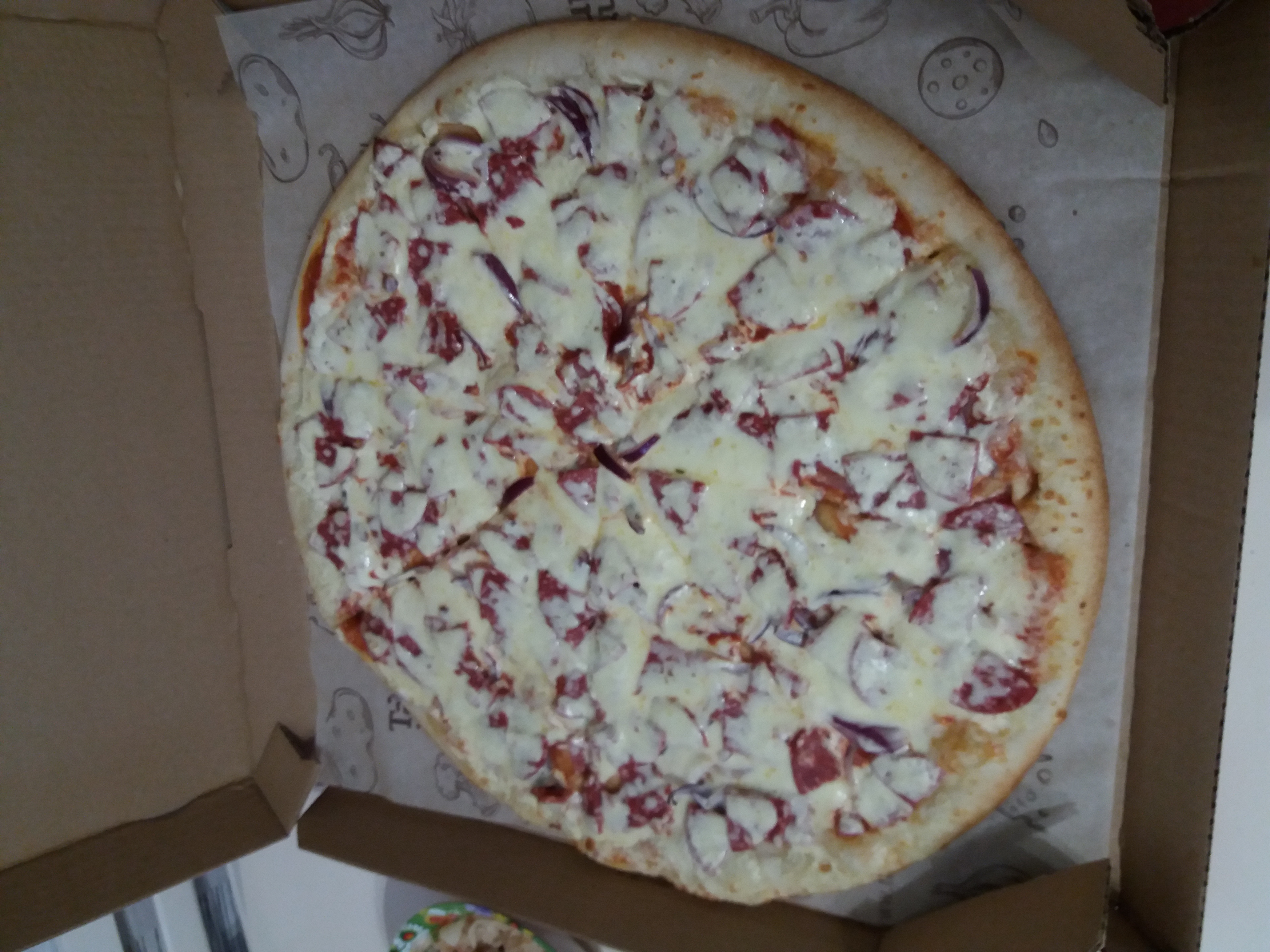 Состав: сервелат, лук красный, сыр "Моцарелла", соус "Томатный", соус "Маджорио".