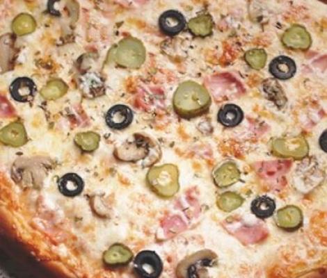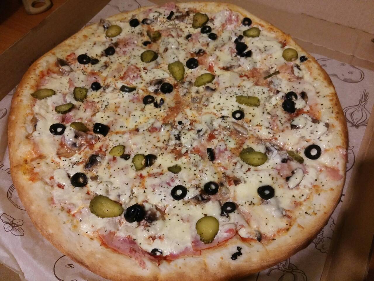 Состав: ветчина, шампиньоны, маринованные огурцы, маслины, сыр "Моцарелла", соус "Томатный", соус "Маджорио", орегано.