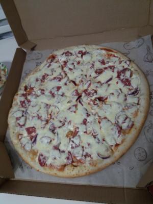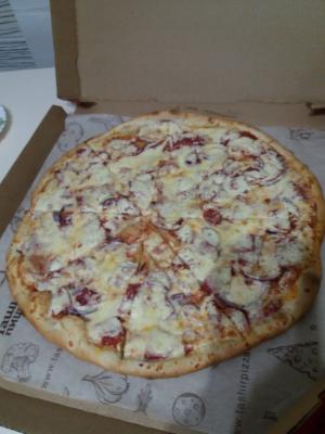 Состав: куриное филе, шампиньоны, бекон, болгарский перец, сыр пармезан, соус Маджорио, соус томатный