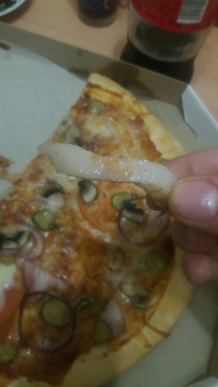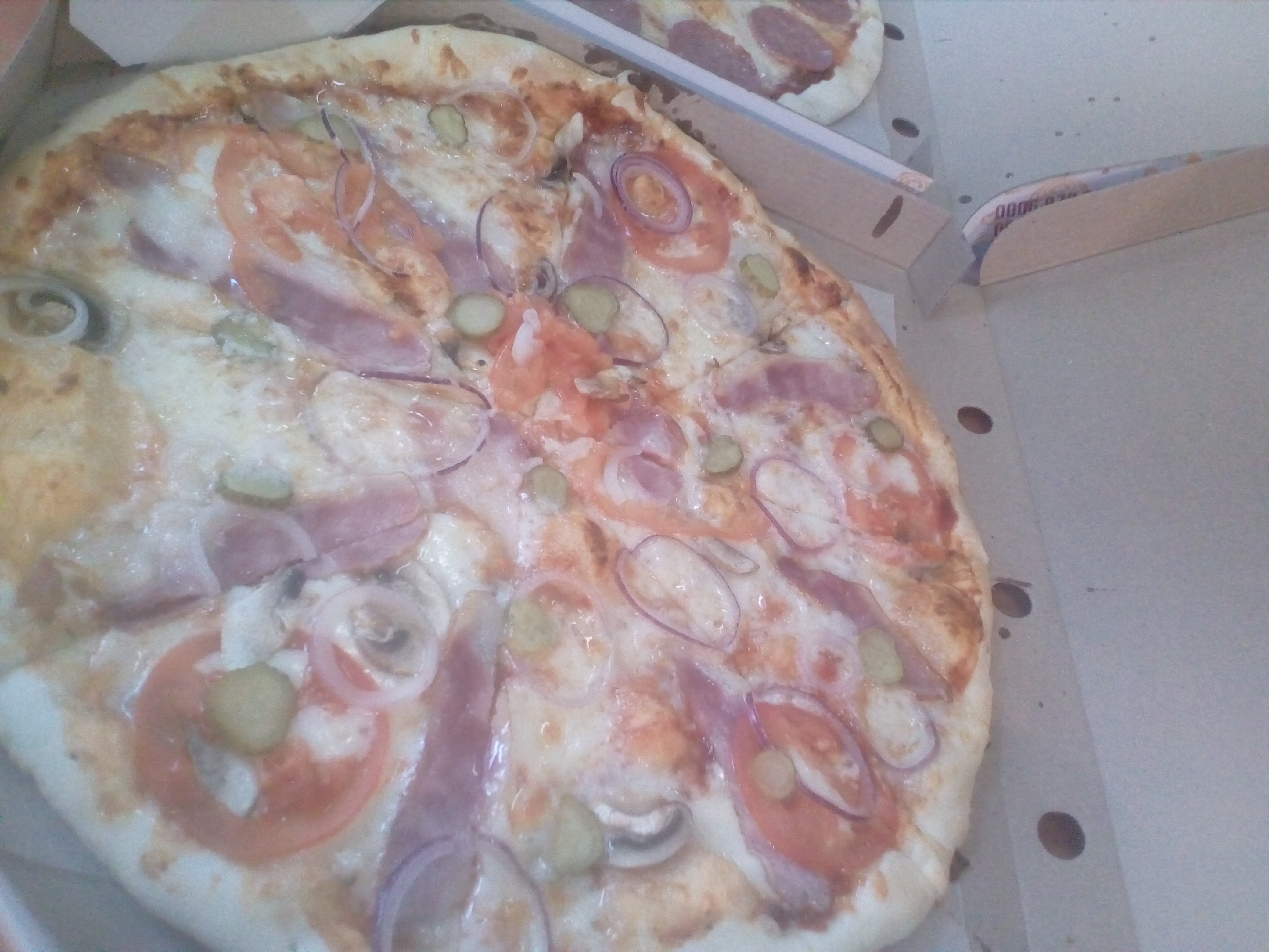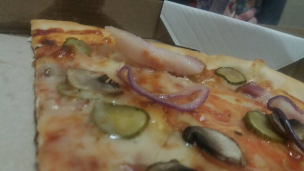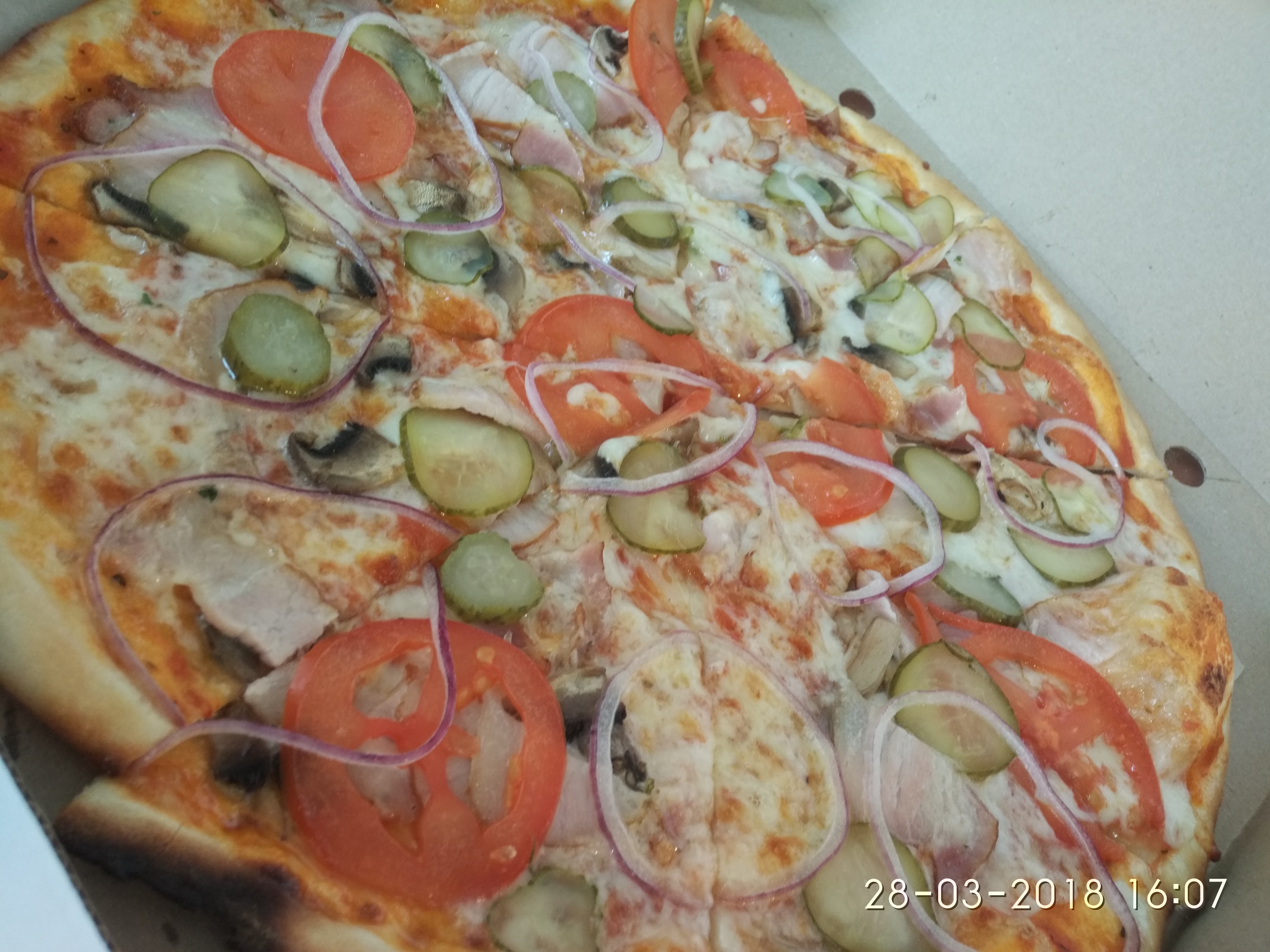 Томатный соус, бекон, томаты, шампиньоны, красный лук, соленые огурцы.
