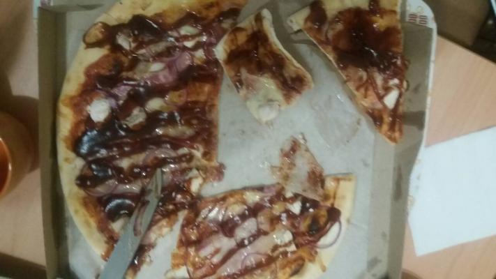 Томатный соус, цыпленок, бекон, красный лук, соус барбекю.