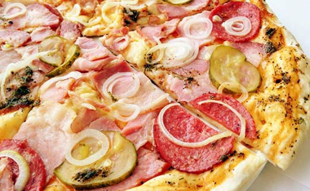 Тесто, приготовленное по нашему особому рецепту, несколько авторских соусов, сыр, маринованный лучок и огурчик, ну и конечно много мяса: ветчина, бекон, колбаска салями...