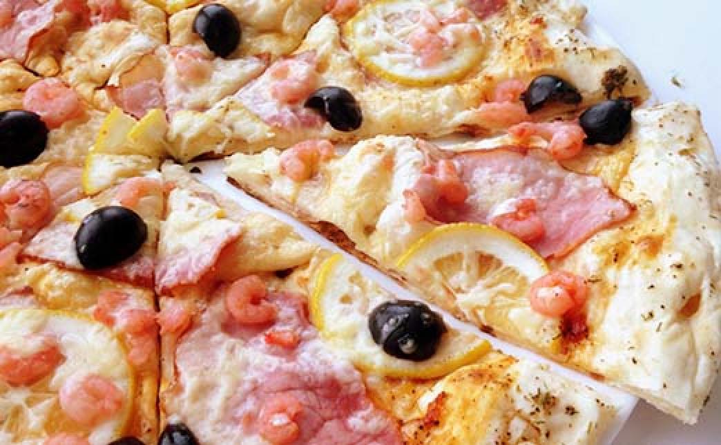 Тесто, приготовленное по особому рецепту, пицца-соусы, сыр, а также ароматная ветчинка в сочетании с креветками, оливками и дольками лимона.