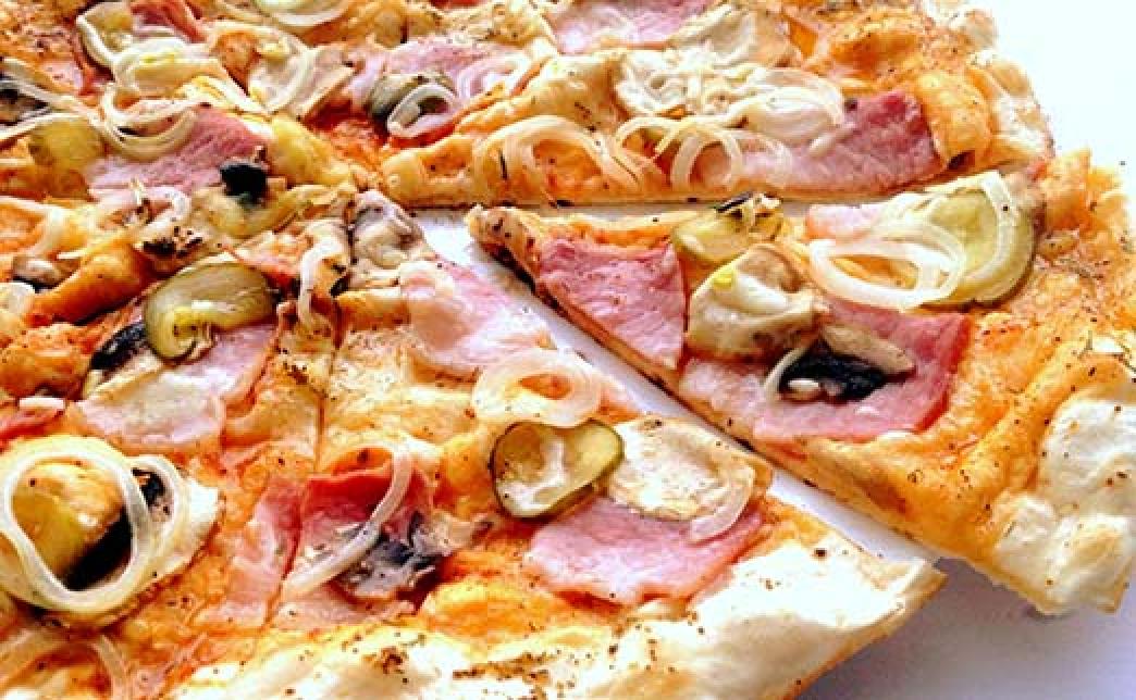 Нежнейшее тонкое тесто, пицца-соусы, сыр, бекон, шампиньоны, маринованный огурчик, лучок, зелень.