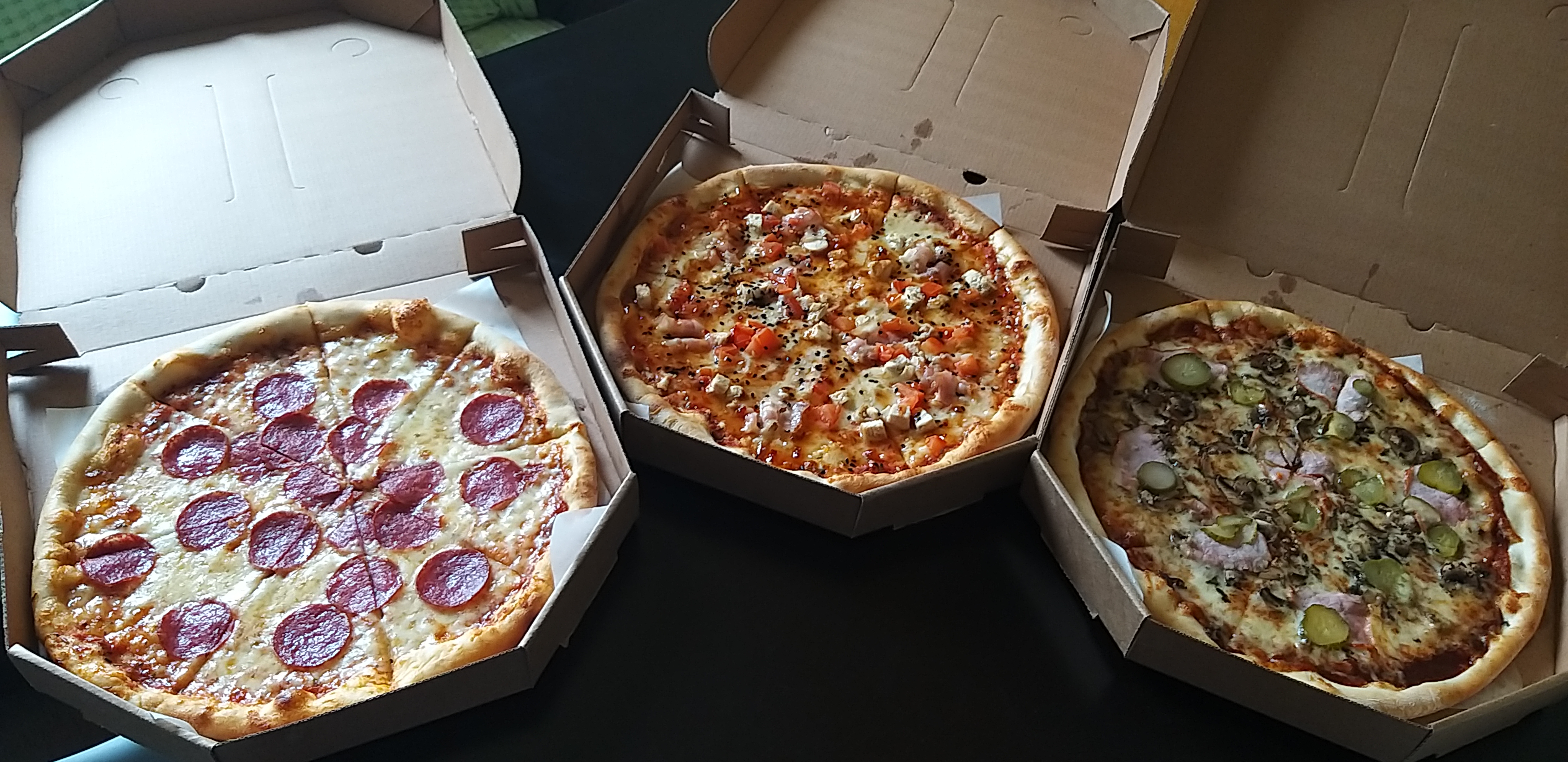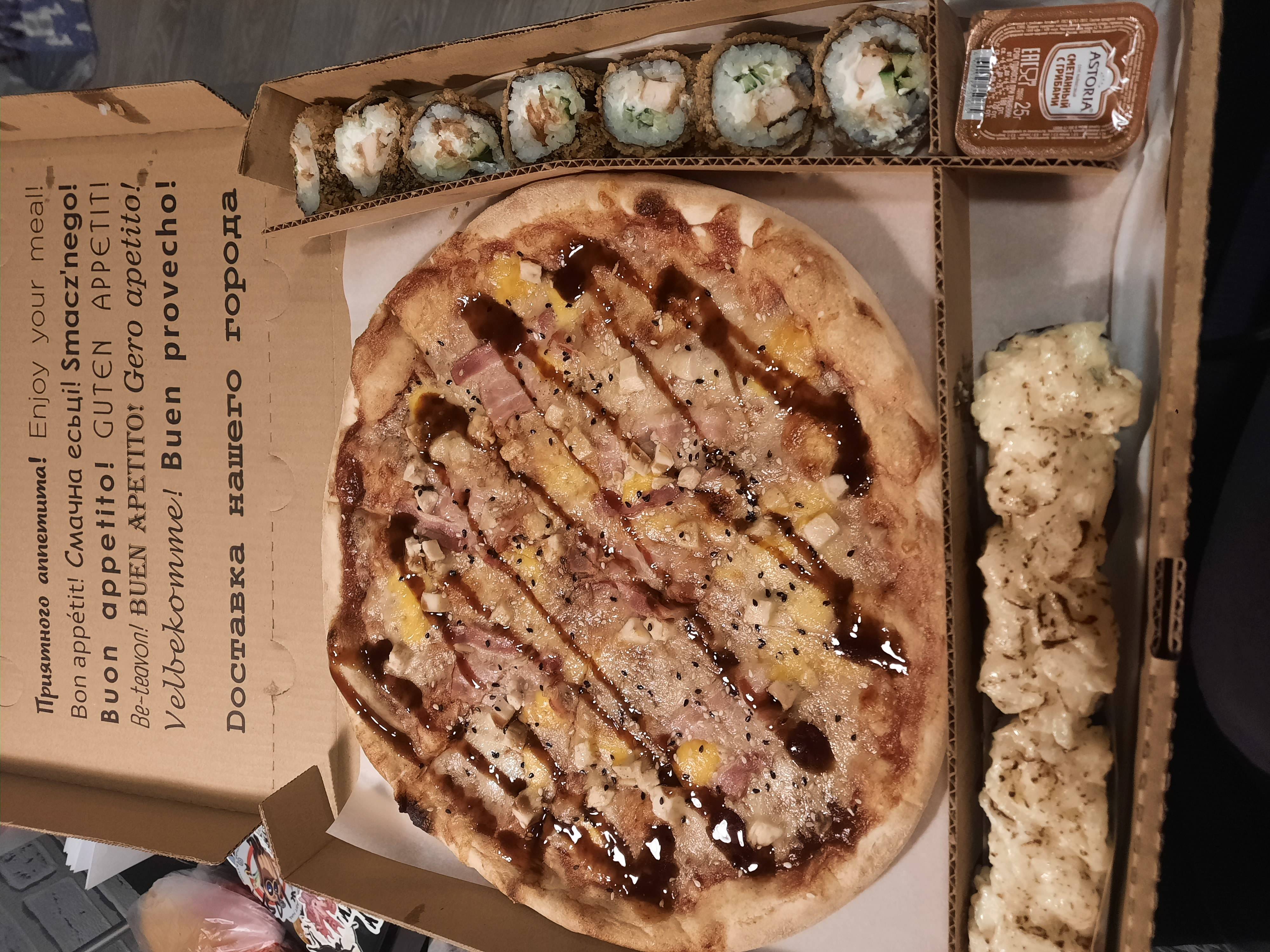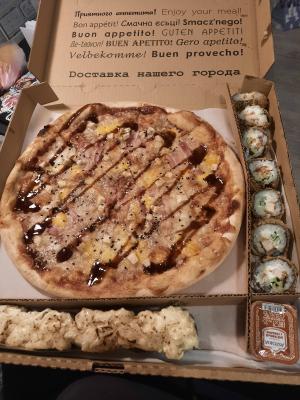 Заказывали сегодня сет их 7 пицц. Доставка вовремя. Пиццы все теплые почти горячие. Несмотря на кое-где черные края, всё вкусно. Спасибо.