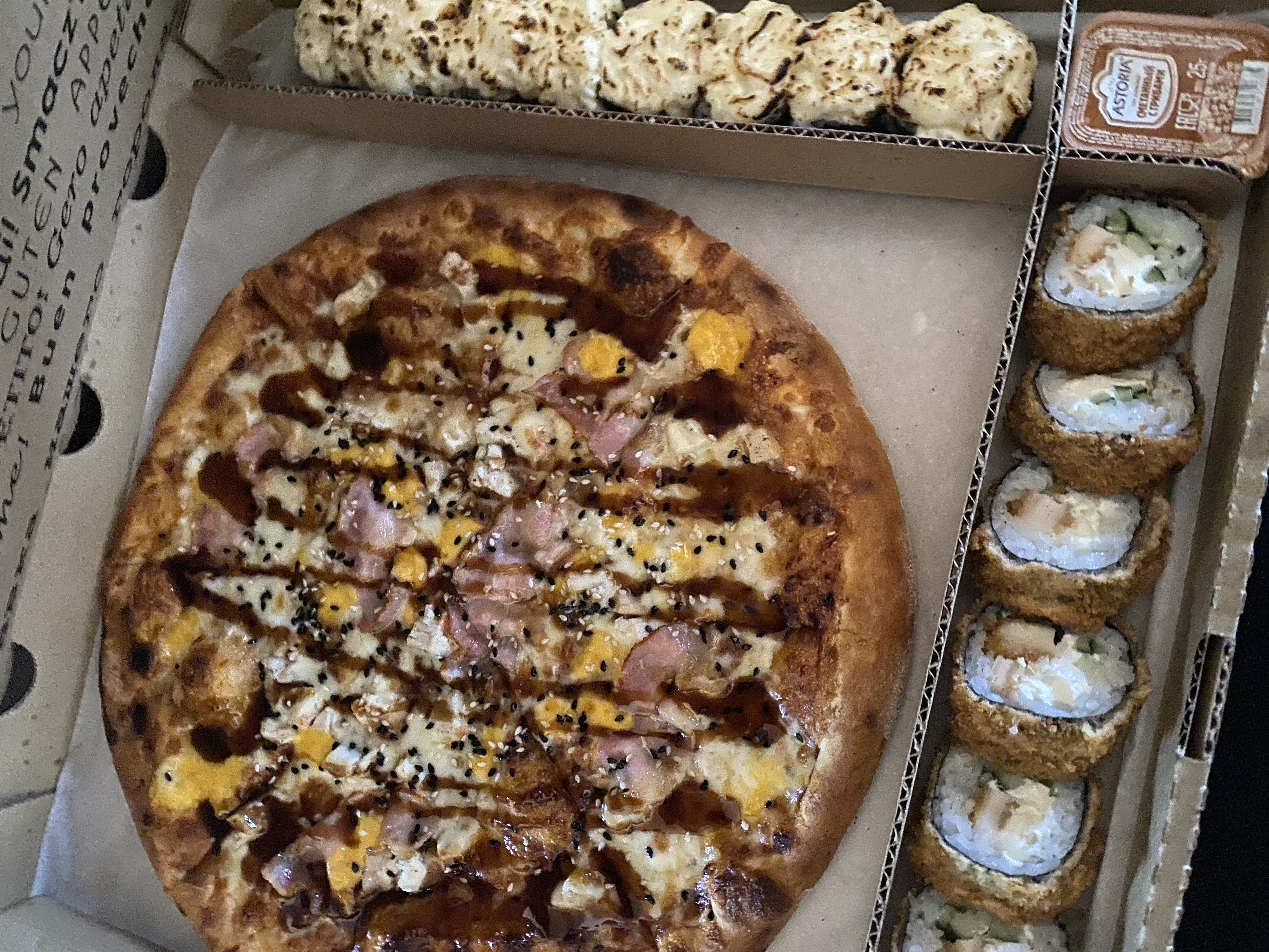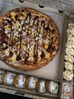 По итогу: пицца приехала холодная, в мокрой упаковке, роллы развалились и не хватало 1-й штуки(ролл в темпуре с правой стороны)