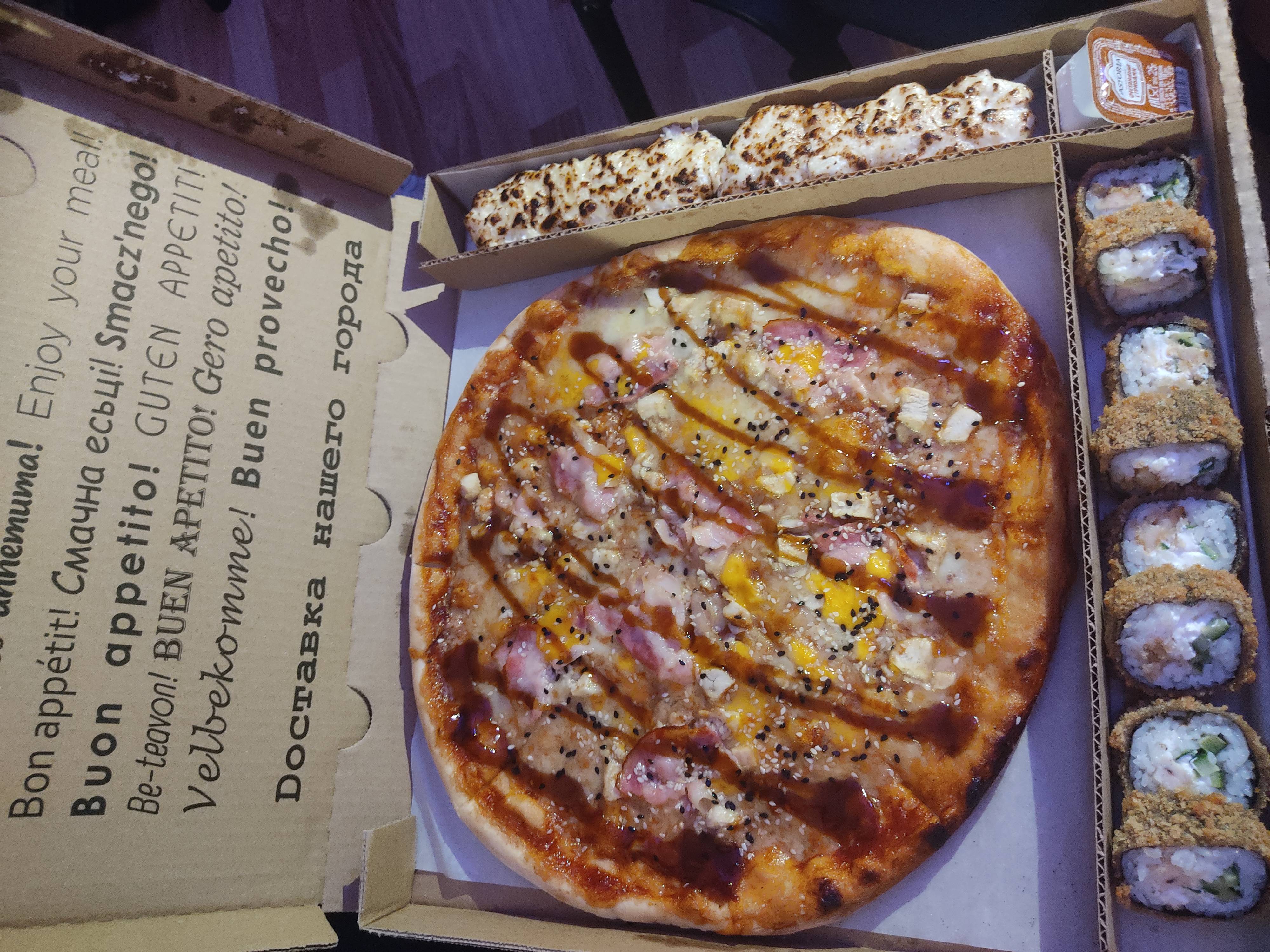 Решили попробовать Фудбокс и остались довольны) Доставка ожидалась с 19 до 20 субботы. По факту привезли в 19.35 ещё теплую. Пицца на тонком тесте, не сухая. Начинки много, сочная. Суши большие по 8 шт. Суши в темпуре очень хоустящие