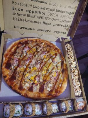Неоднократно заказываем здесь пиццу, суши, решили попробовать Фудбокс. Доставка вовремя, даже чуть раньше. В пицце много начинки, вкусный соус. Суши необычные, одни теплые с цыплёнком, вторые с окунем в хрустящей панировке. Как и всегда, всё отлично, рекомендуем!