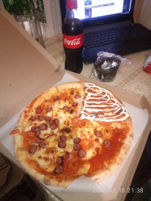 Заказали пиццу пару часов назад. Привезли в то время, в какое договорились. Пицца тёплая, начинки много, сочная! Нам все понравилось! Удачи вам ! И побольше таких акций!