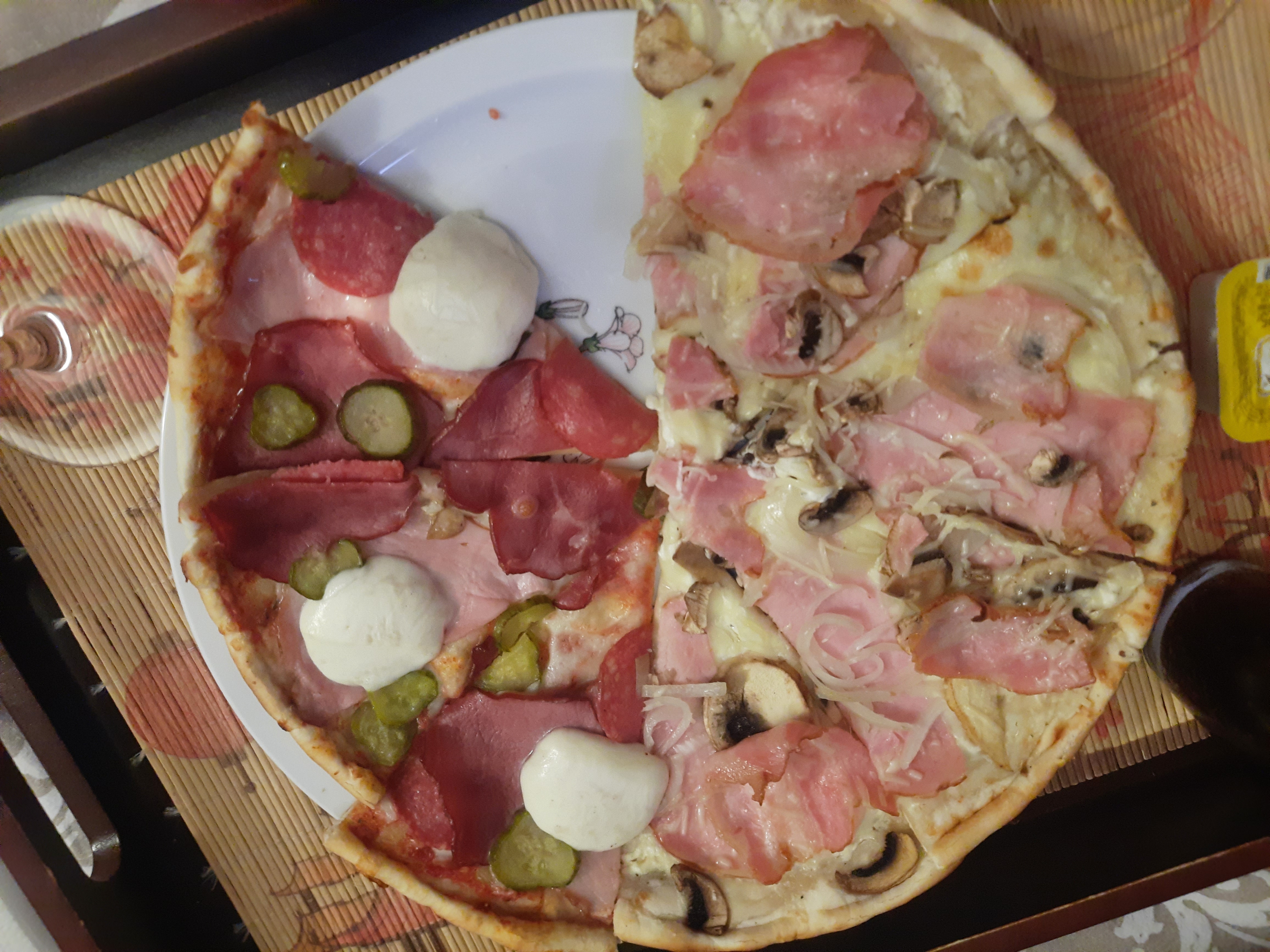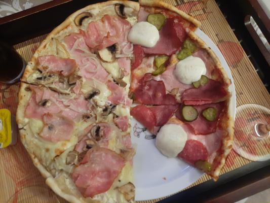 Состав: соус, сыр моцарелла, ветчина, салями, телятина, корнишоны