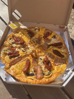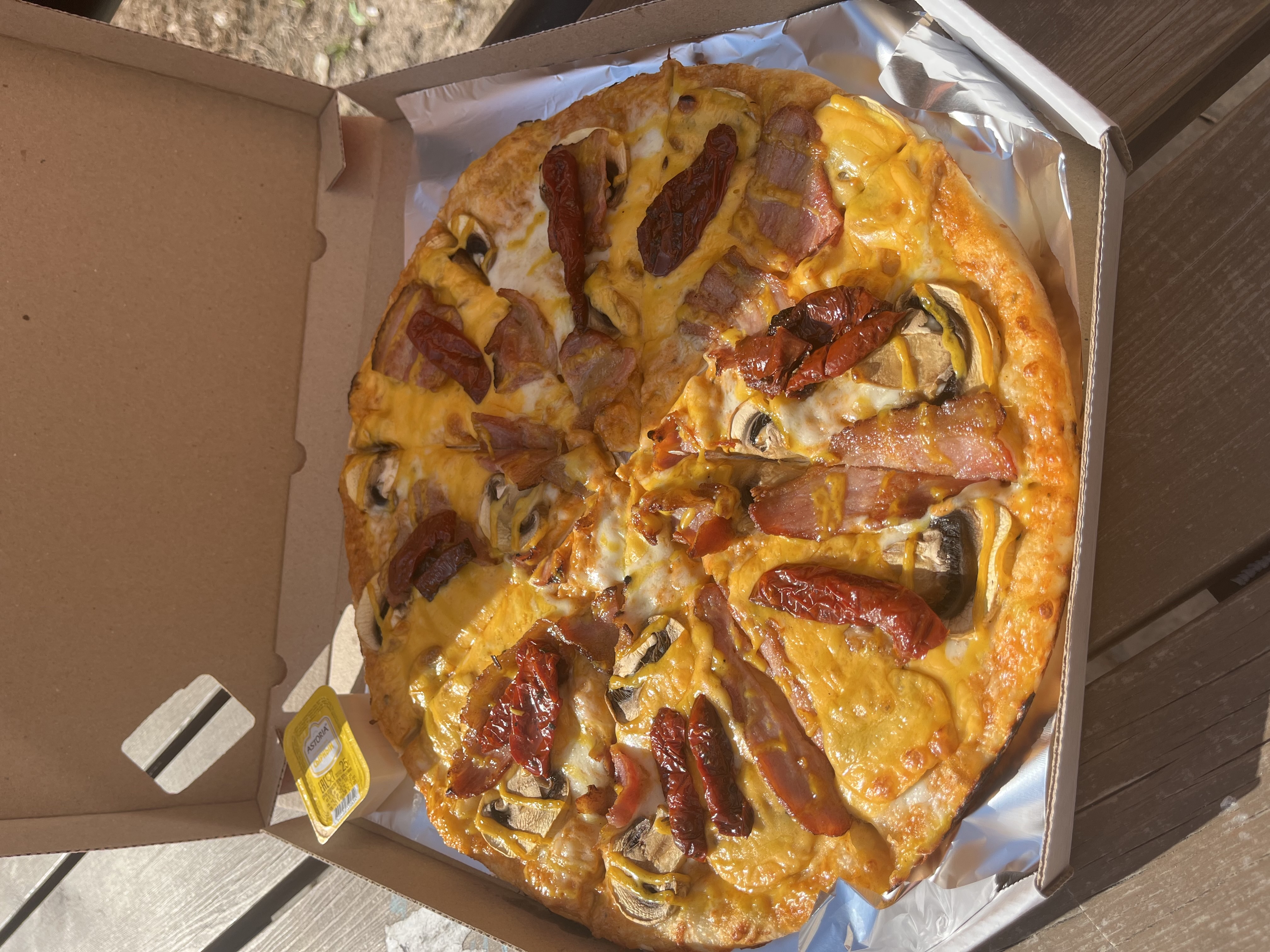 Состав: соус 1000 островов, соус горчичный, сыр моцарелла, бекон жаренный, вяленые томаты, шампиньоны свежие, сыр чеддер