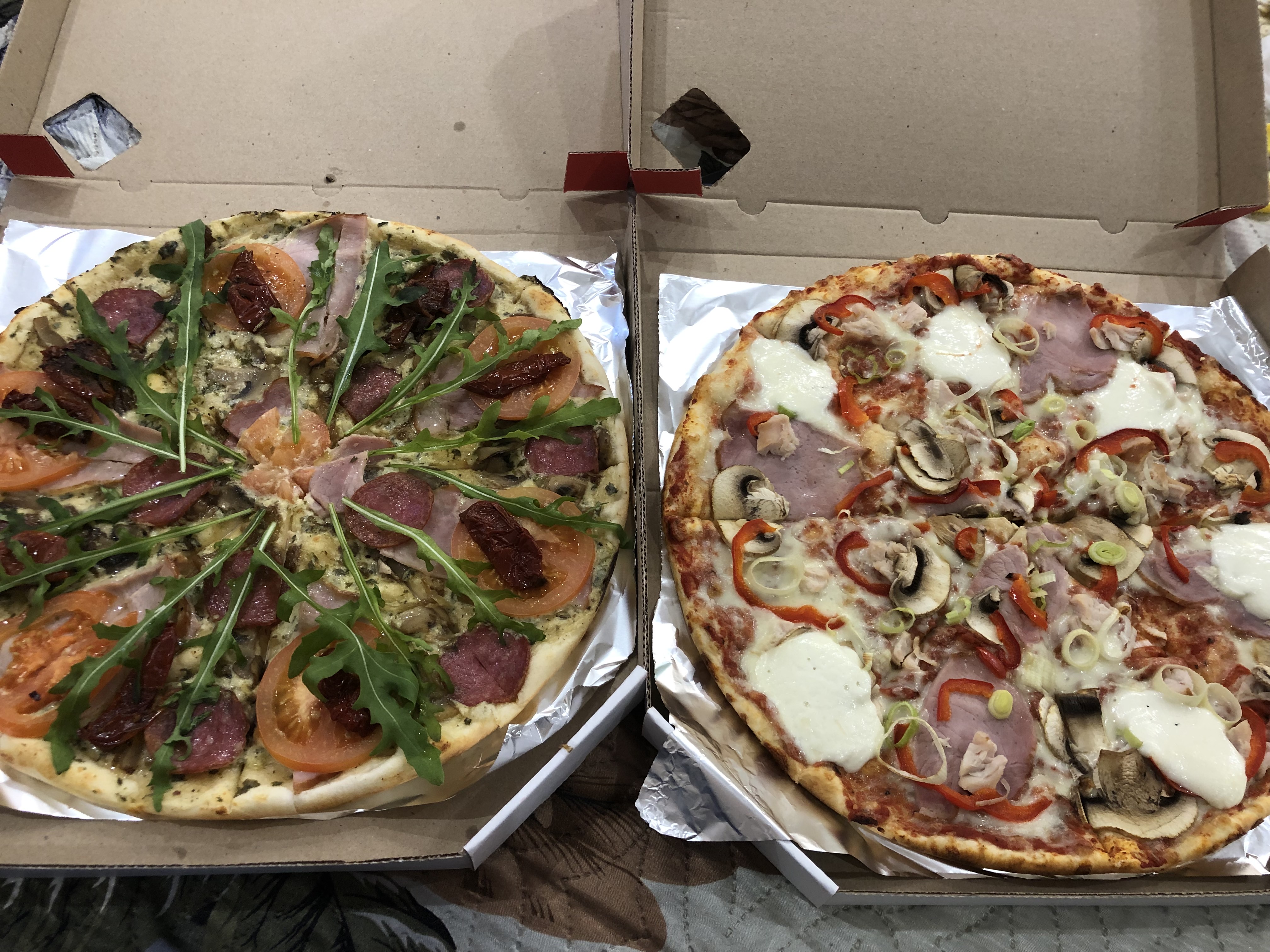 Состав: соус альфредо со шпинатом, томаты свежие, вяленые томаты, грибное соте, ветчина, салями, рукола