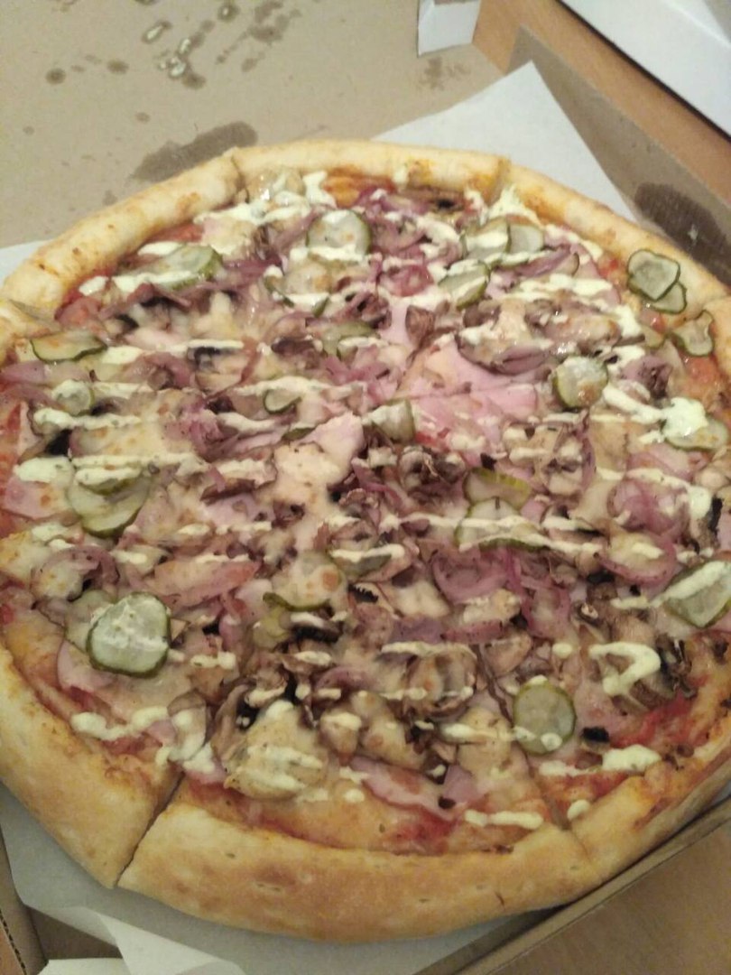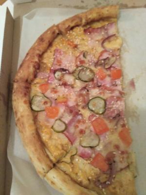 Заказывали три пиццы,. Начинка вкусная, но сами пиццы очень сухие. Забирали сами, были готовы в оговоренное время.