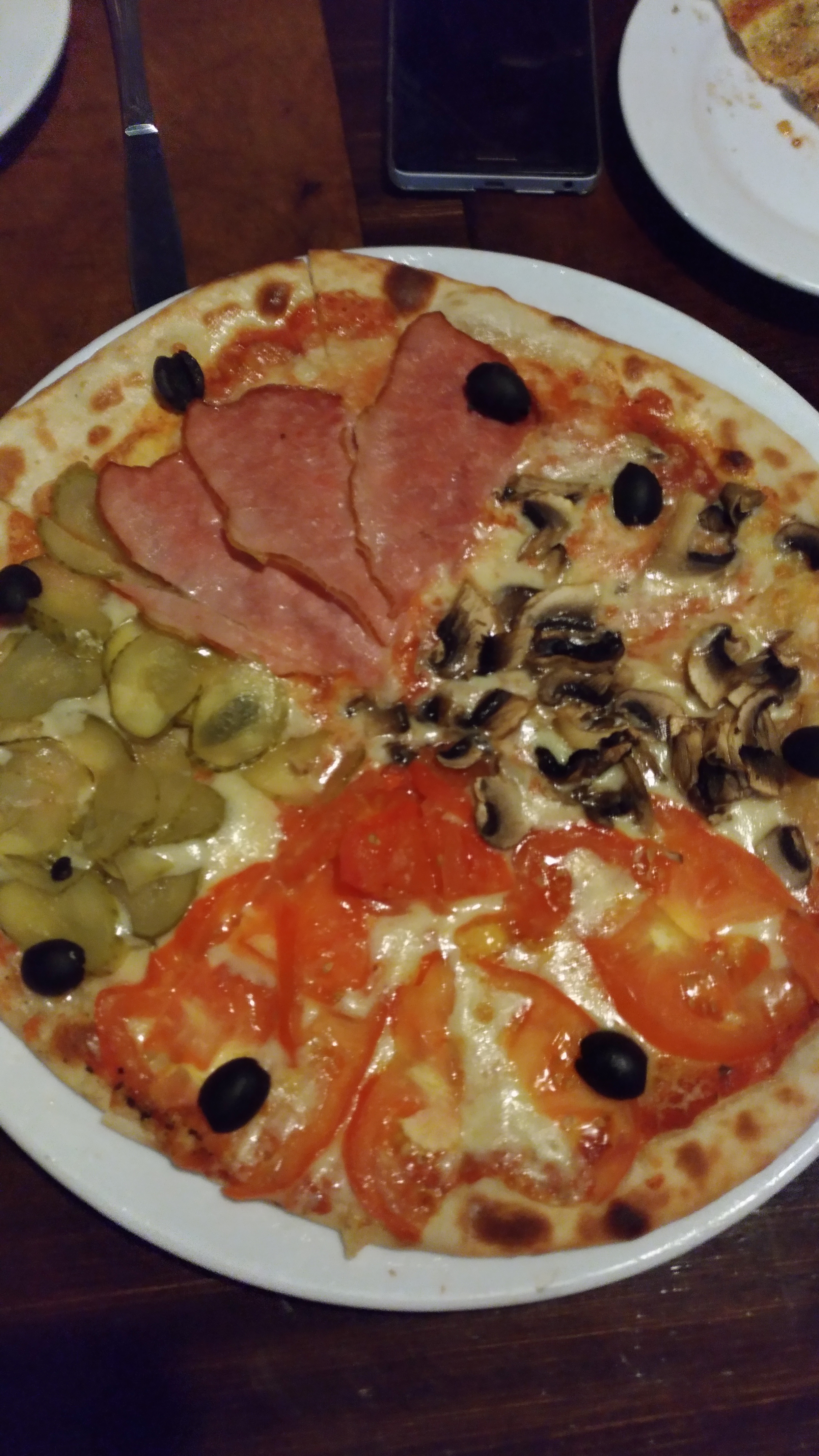 Пицца "Четыре сезона" (Огурцы консервированные, шампиньоны свежие, томаты, грудинка к/в, маслины, сыр Моцарелла - 540 г):
