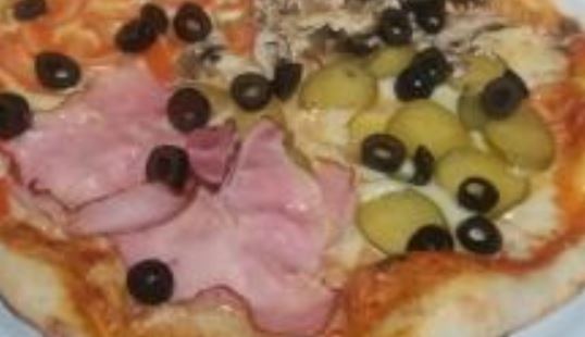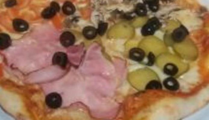 Пицца "Четыре сезона" (Огурцы консервированные, шампиньоны свежие, томаты, грудинка к/в, маслины, сыр Моцарелла - 540 г):