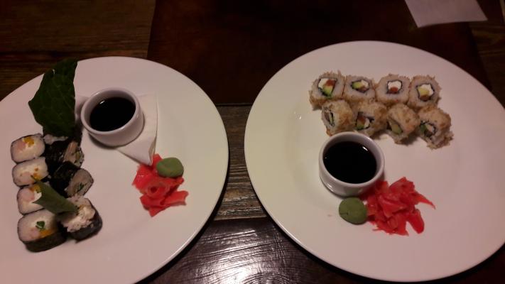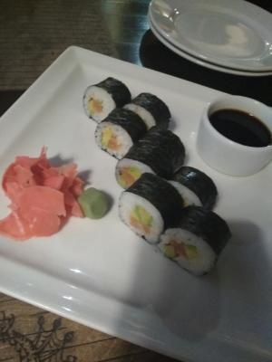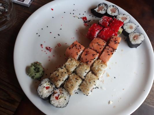 Заказали суши-сет по купону, салат и сырные палочки. Суши не просто разваливались, они рассыпались при попытке их взять. Роллы были скручены просто отвратительно, пустоты бросались в глаза. Порезаны даже близко не равномерно. Лосось был ледяной, рыбу явно держали в морозильнике. Вместо васаби принесли просто хрен.