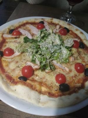 Пицца "Цезарь" (Сыр моцарелла, томаты, оливки, заправка "цезарь", филе куриное, сыр джюгас, микс салат - 460 г):