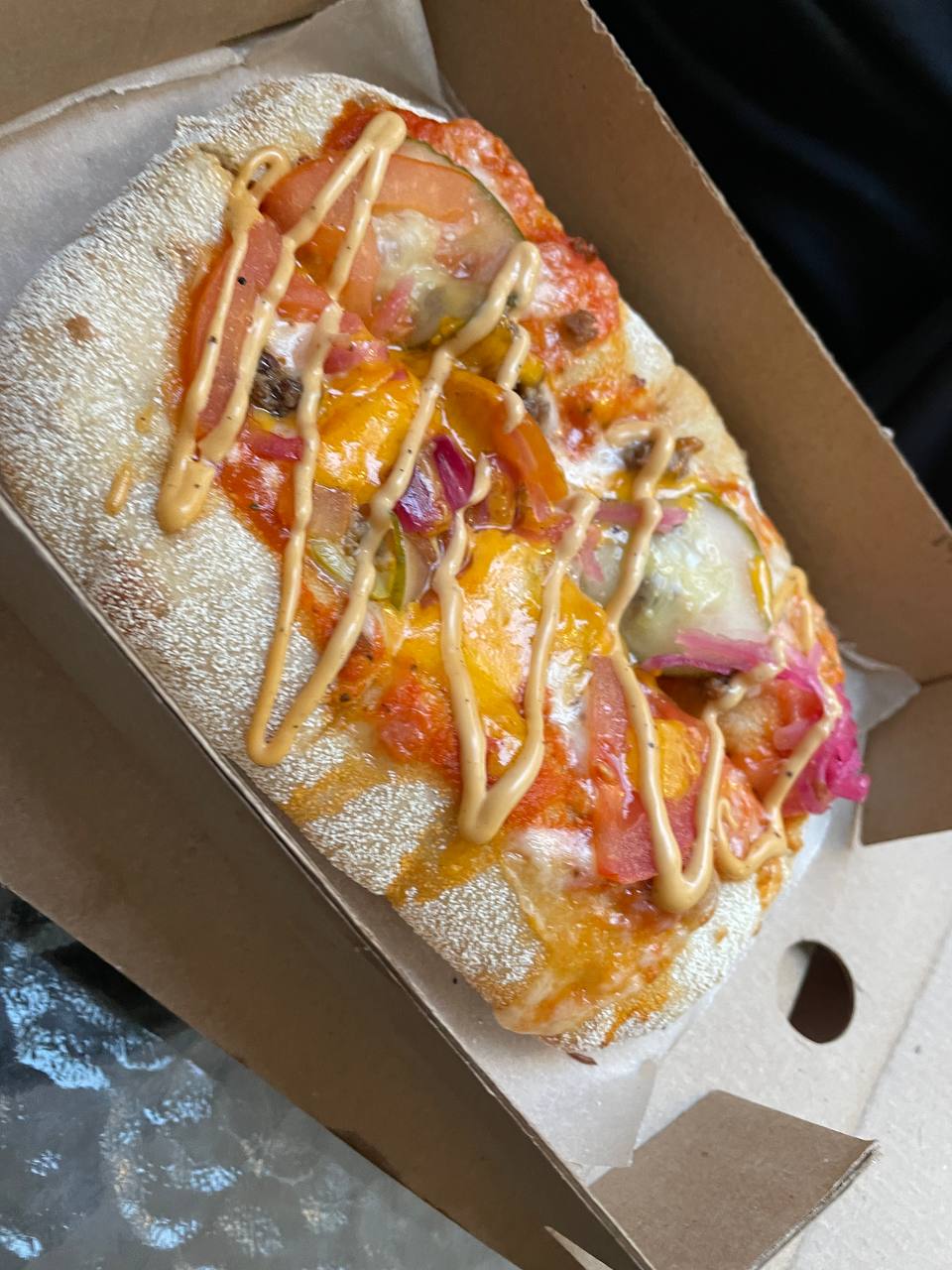 - "Бургер": соус томатный, сыр моцарелла, фарш говяжий, томат, огурец маринованный, лук маринованный, сыр чеддер, соус гриль, пряное масло - 500 г