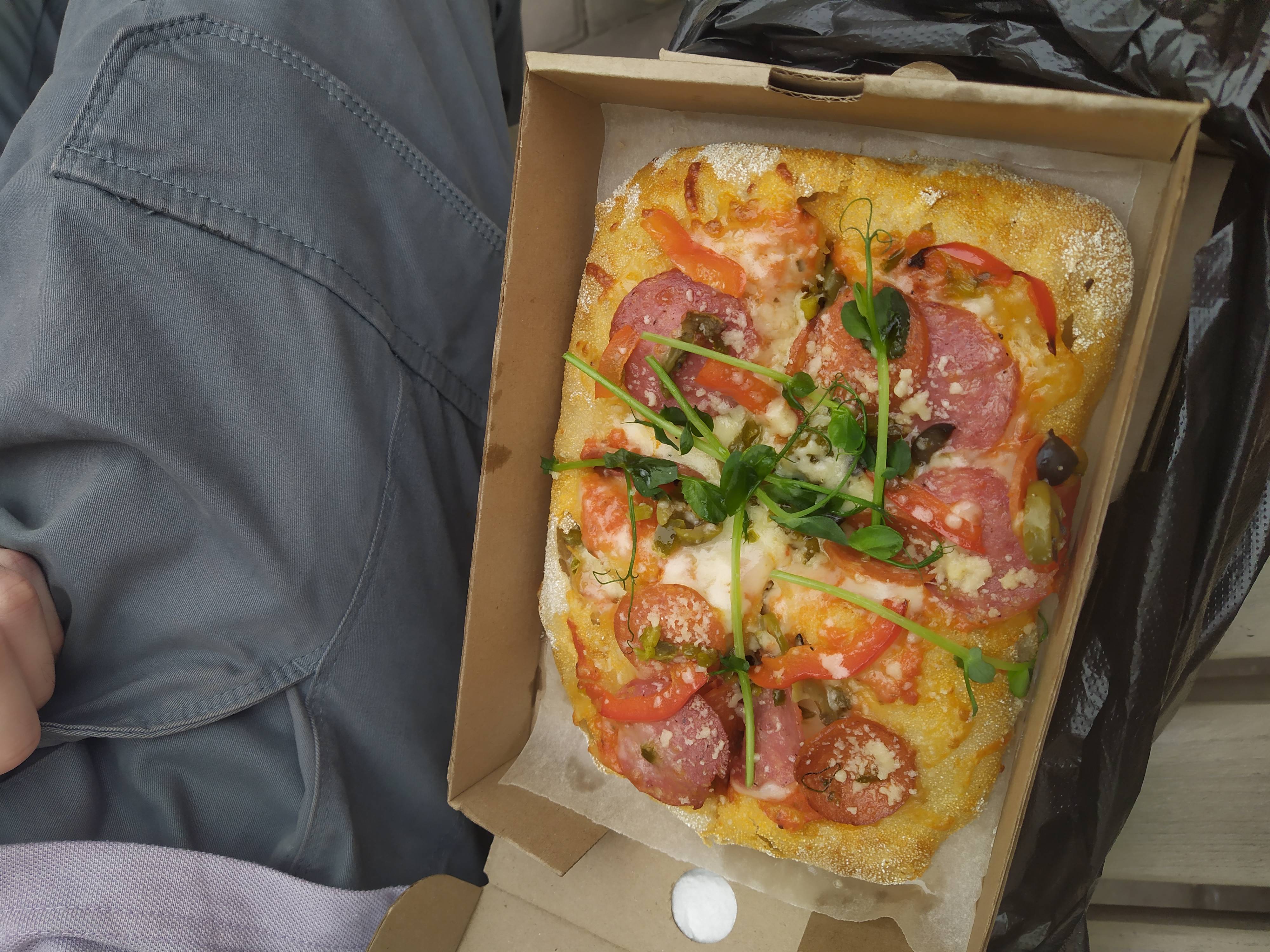 - пицца "Сицилия": соус томатный, сыр моцарелла, колбаса салями, колбаса пеперони, перец болгарский, маслины, оливки, перец халапеньо, пряное масло - 250 г