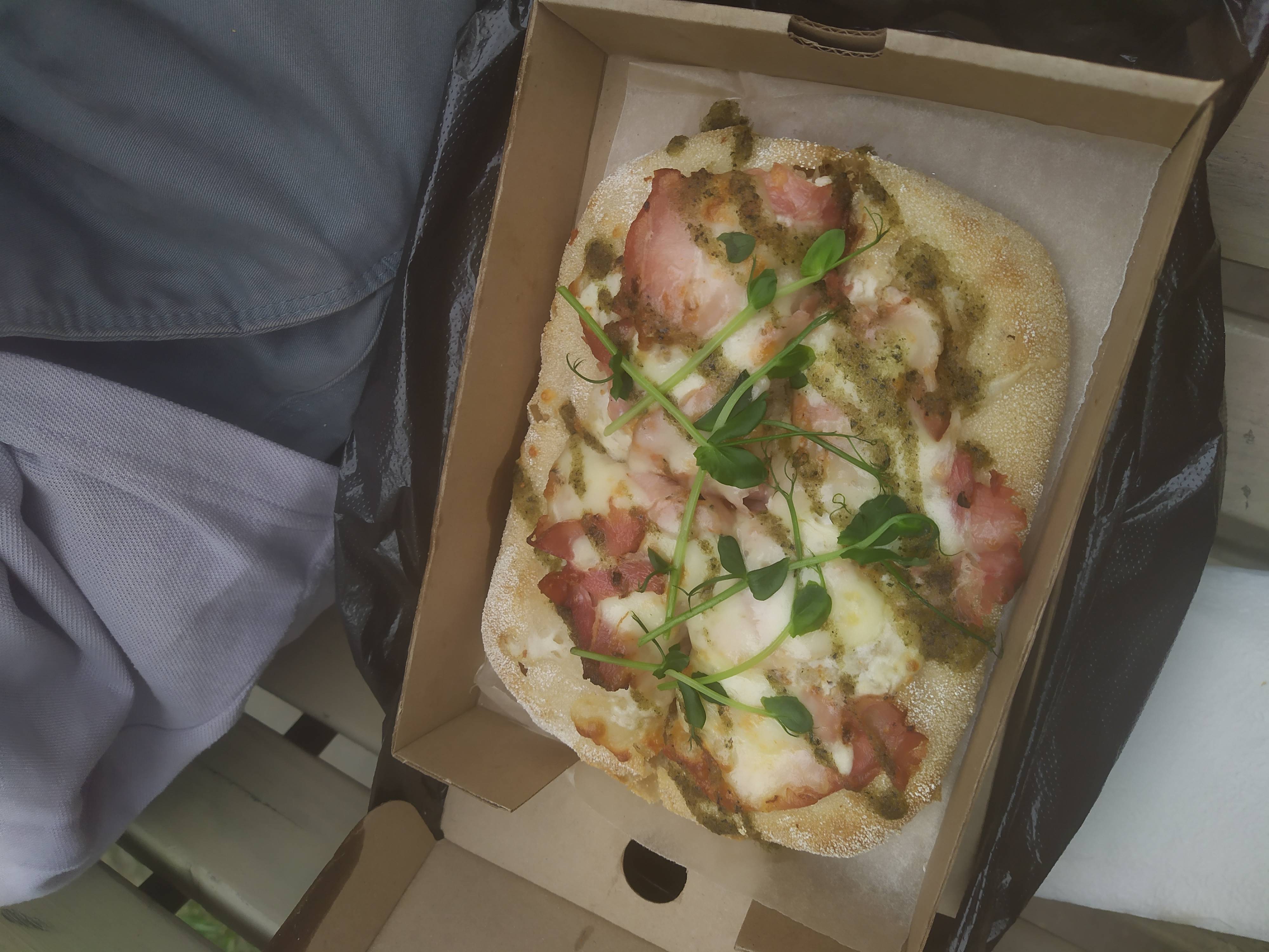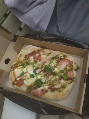 - пицца "Карбонара": соус сливочный, сыр моцарелла, грудинка, пармезан, песто, пряное масло - 250 г