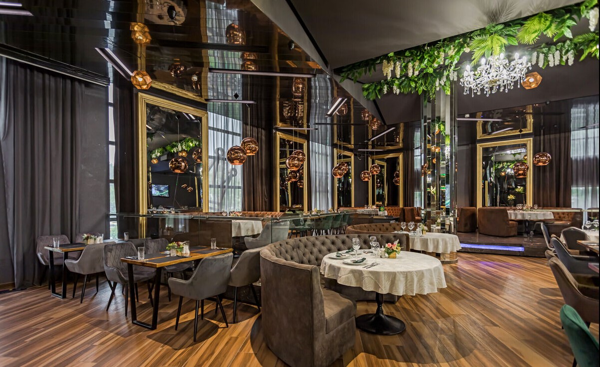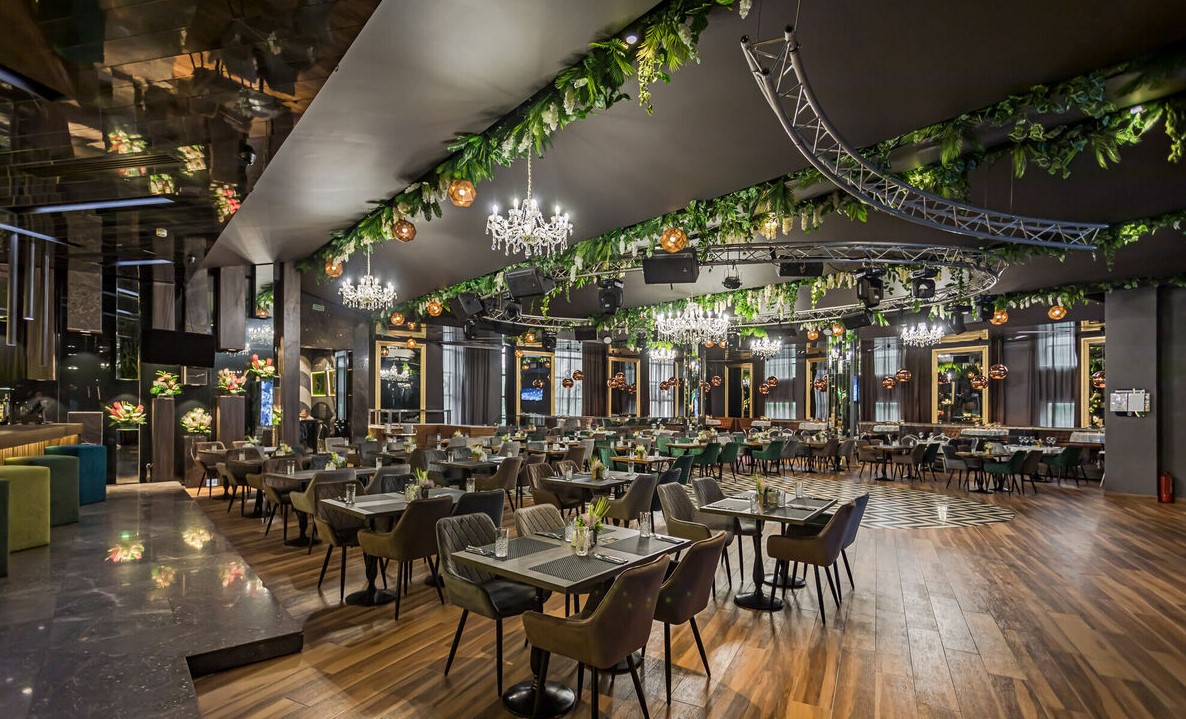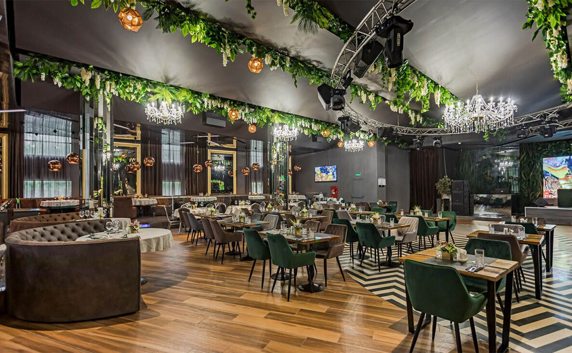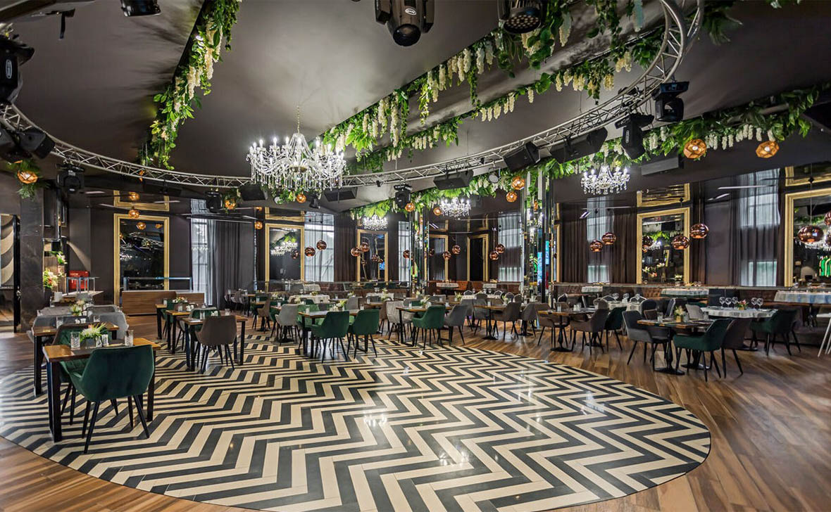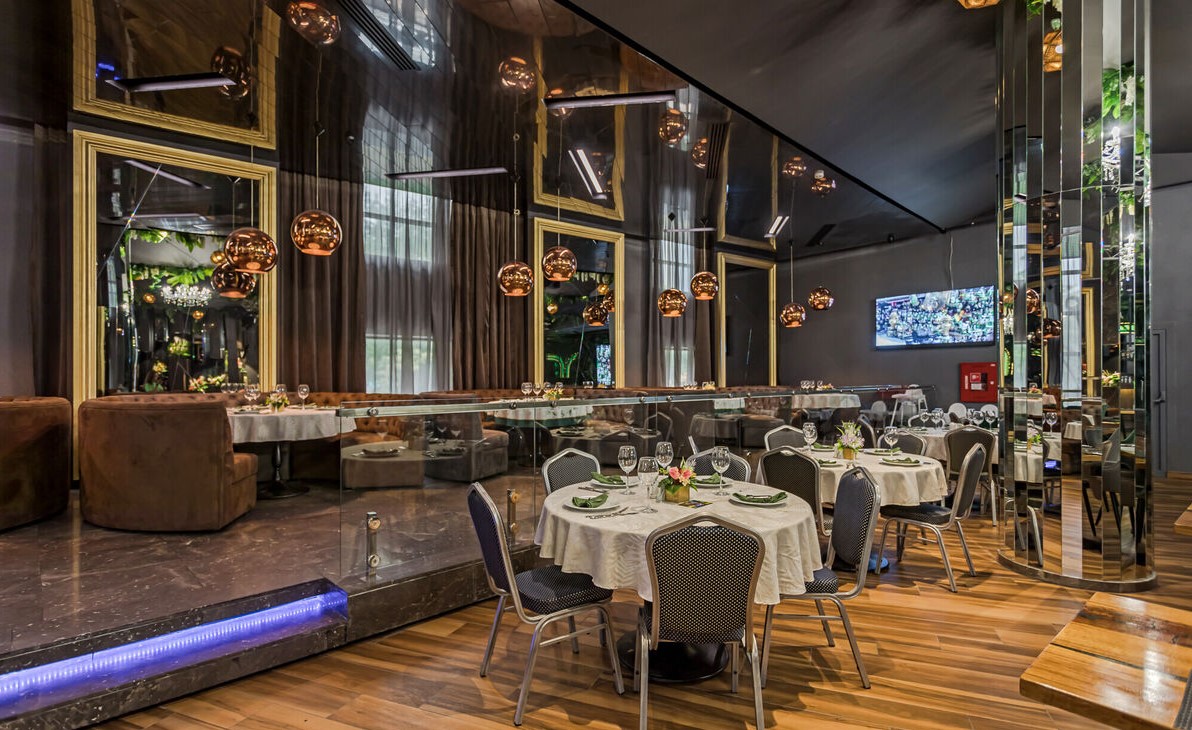 Просторный стильный зал ресторана вмещает 150 гостей и располагает двумя VIP-зонами для желающих уединиться и провести приятный вечер в узком кругу. Современный дизайн и функциональность размещения столиков позволяет здесь устроить как дружескую вечеринку или отметить торжество в компании друзей и близких, так и провести романтическое свидание.