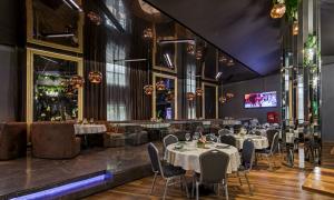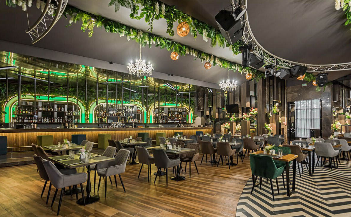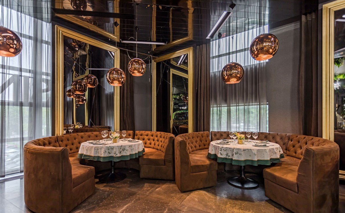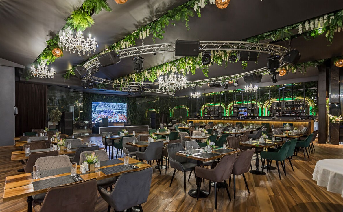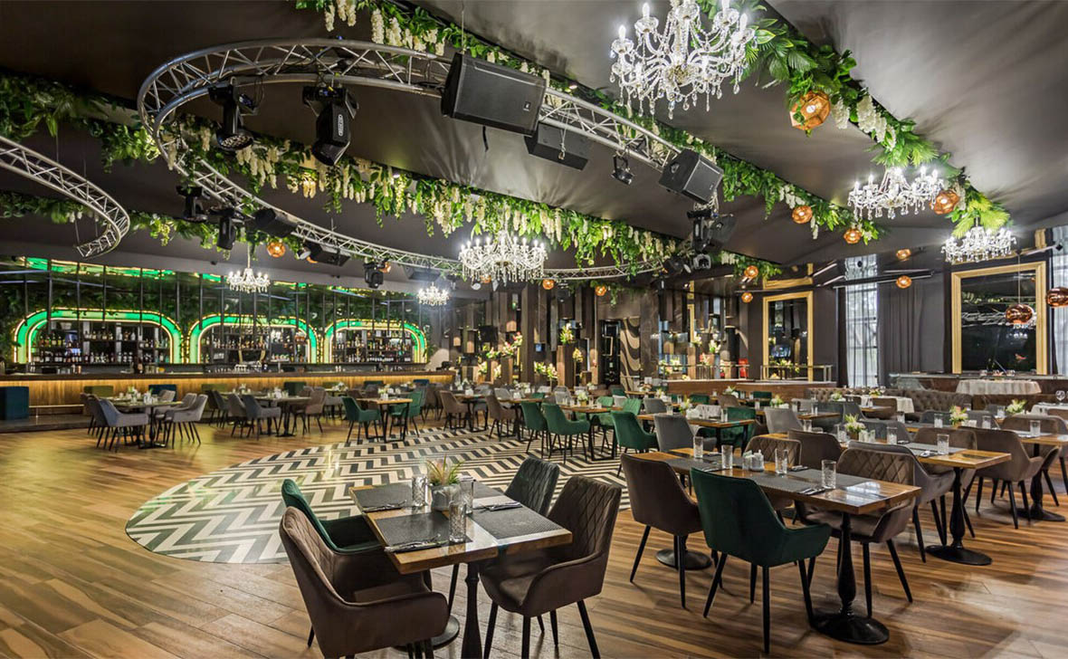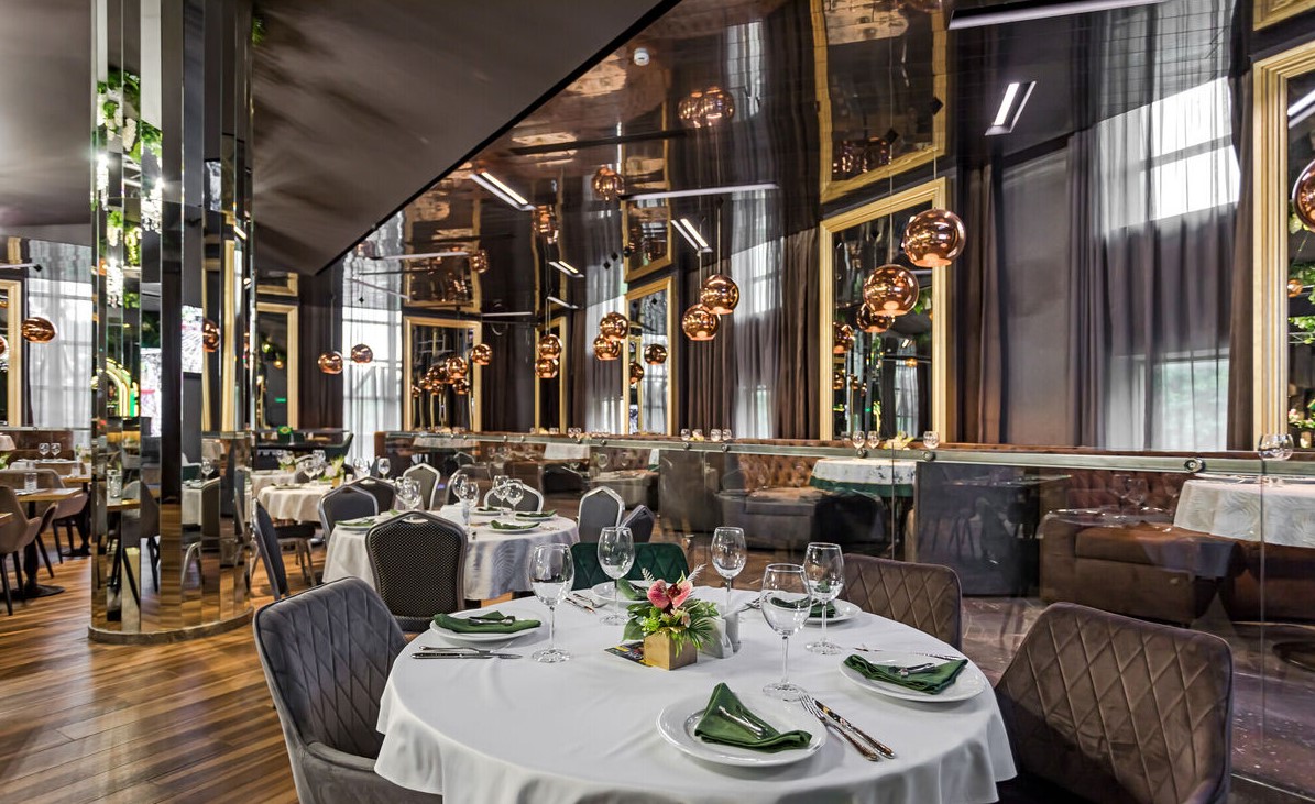 Просторный стильный зал ресторана вмещает 150 гостей и располагает двумя VIP-зонами для желающих уединиться и провести приятный вечер в узком кругу. Современный дизайн и функциональность размещения столиков позволяет здесь устроить как дружескую вечеринку или отметить торжество в компании друзей и близких, так и провести романтическое свидание.