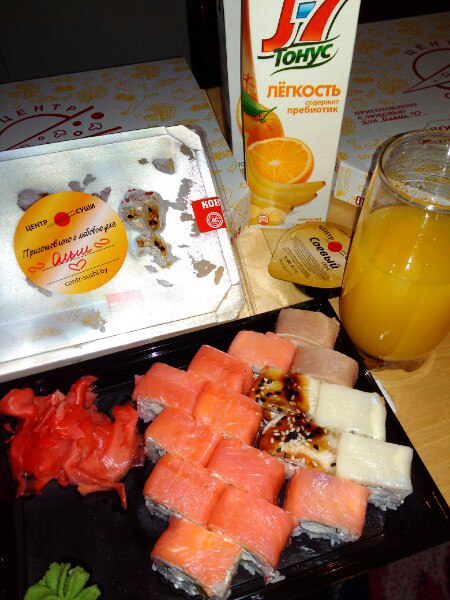 - ролл "Лосось" (110 г). Состав: рис, нори, лосось