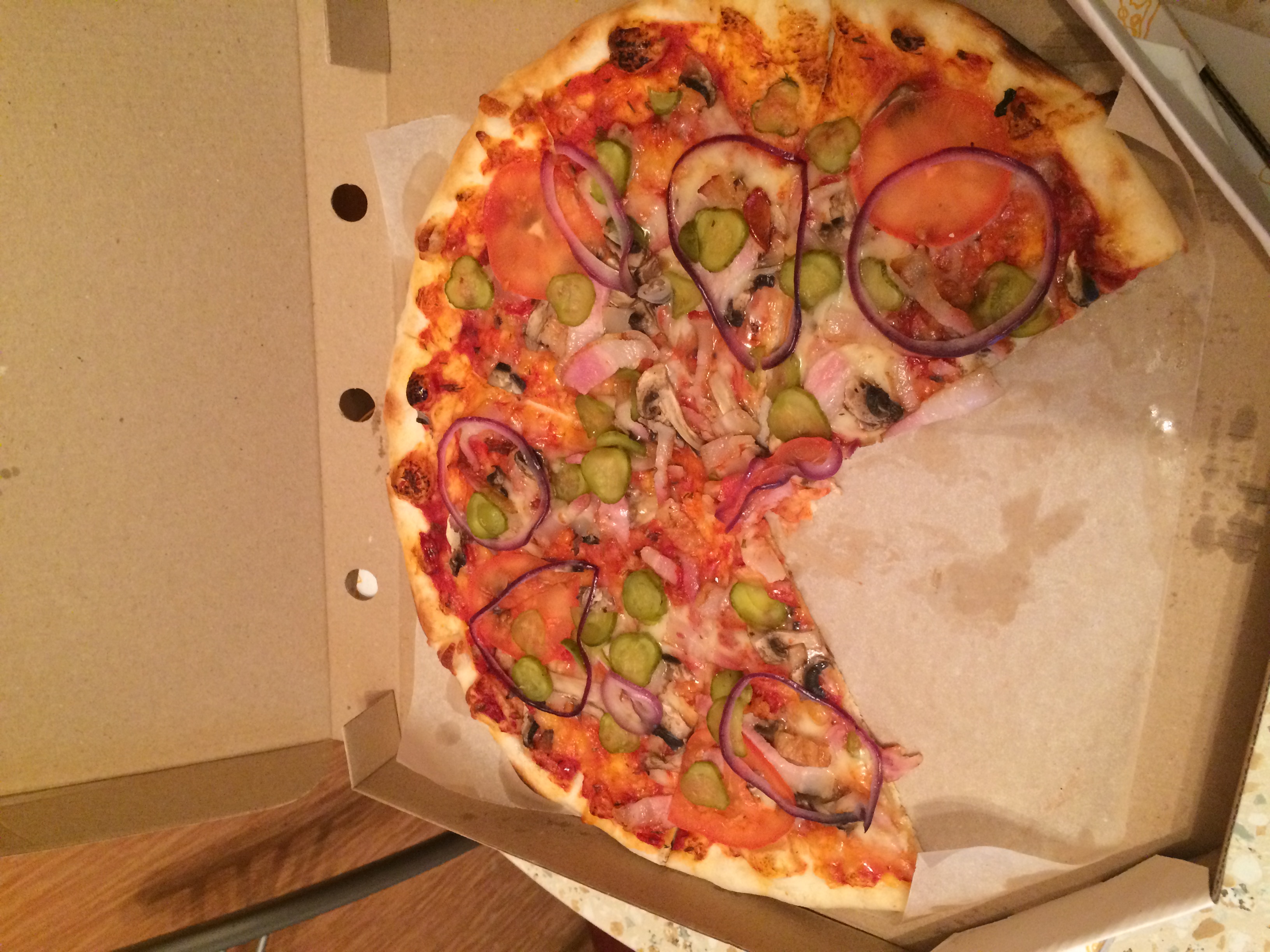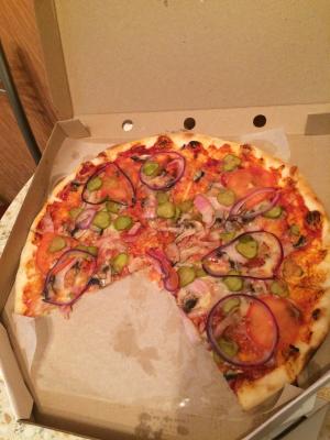 - пицца "Сицилия" (480 г). Состав: томатный соус, бекон, томаты, шампиньоны, красный лук, соленые огурцы