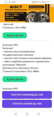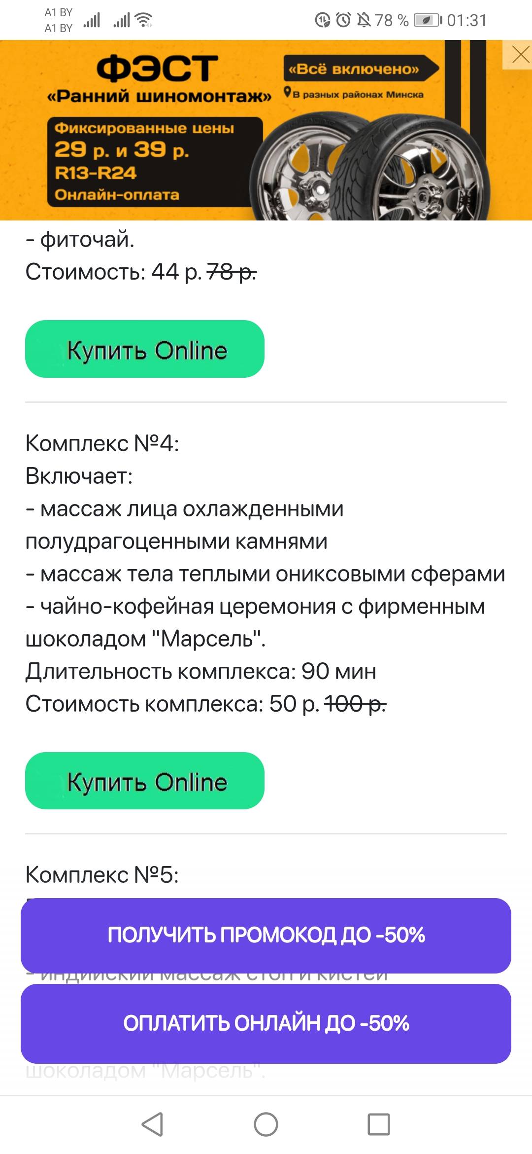 Комплекс №1 (90 мин, в салоне на Юго-Западе) 50 р. 70 р. Включает: - женская стрижка - восстанавливающий уход для волос Комплекс №2 (90 мин) 65 р. 78 р. Включает: - сеанс в инфракрасной сауне (30 мин) - аромамассаж (60 мин) - чайная церемония согласно чайной карте (15 мин) Комплекс №3 (в салоне на пл. Победы) 75 р. 88 р. Включает: - сеанс в кедровой бочке (30 мин) - аромамассаж всего тела (60 мин) - фиточай Комплекс №4 (90 мин) 60 р. 120 р. Включает: - массаж лица охлажденными полудрагоценными камнями - массаж тела теплыми ониксовыми сферами - чай, кофе, питьевая вода на выбор Комплекс №5 (90 мин) 119 р. 136 р. Включает: - тайский массаж шейно-воротниковой зоны - индийский массаж стоп и кистей - японский массаж лица Асахи - чай, кофе, питьевая вода на выбор Комплекс №7 (в салоне на пл. Победы) 95 р. 146 р. Включает: - сеанс в кедровой бочке (30 мин) - шоколадное скрабирование - шоколадное обертывание - шоколадный массаж всего тела (30 мин) - чайная церемония согласно чайной карте (15 мин) Комплекс №8 (120 мин) 85 р. 124 р. Включает: - массаж кистей рук - медовый массаж стоп - массаж живота - медовый массаж всего тела - чай, кофе, питьевая вода на выбор Комплекс №11 (120 мин) 100 р. 160 р. Включает: - СПА обертывание на выбор - женская стрижка - восстанавливающий уход для волос - чай, кофе, питьевая вода на выбор Комплекс №12 (120 мин) 100 р. 160 р. Включает: - СПА обертывание на выбор - полный индийский ритуал "Махараджа" - чай, кофе, питьевая вода на выбор Комплекс №17 (около 5 часов) 285 р. 320 р. Включает: - золотое обертывание тела - массаж лица и декольте с лимфодренажным действием - карбокситерапия лица - маникюр с долговременным покрытием - педикюр с долговременным покрытием - чай, кофе, питьевая вода на выбор |