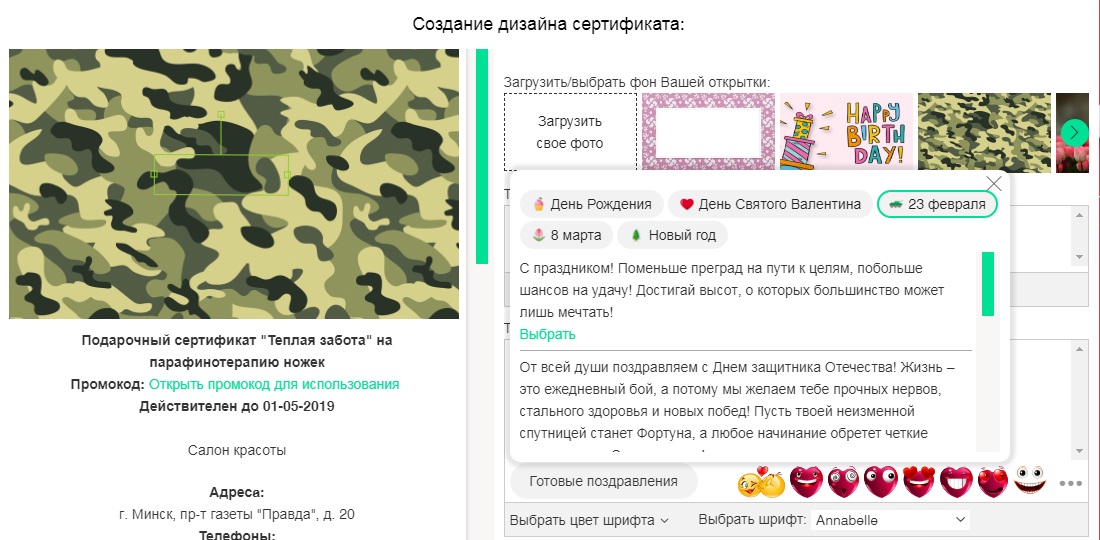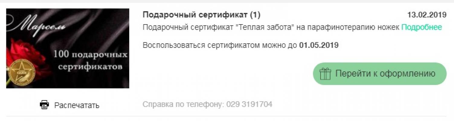- После совершения онлайн-оплаты электронный подарочный сертификат можно скачать в личном кабинете или получить на почту, а также переоформить в салоне в поздравительный конверт за дополнительную плату 5 р. за один сертификат