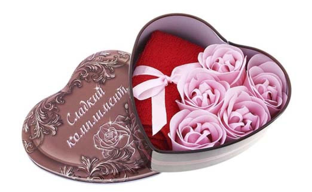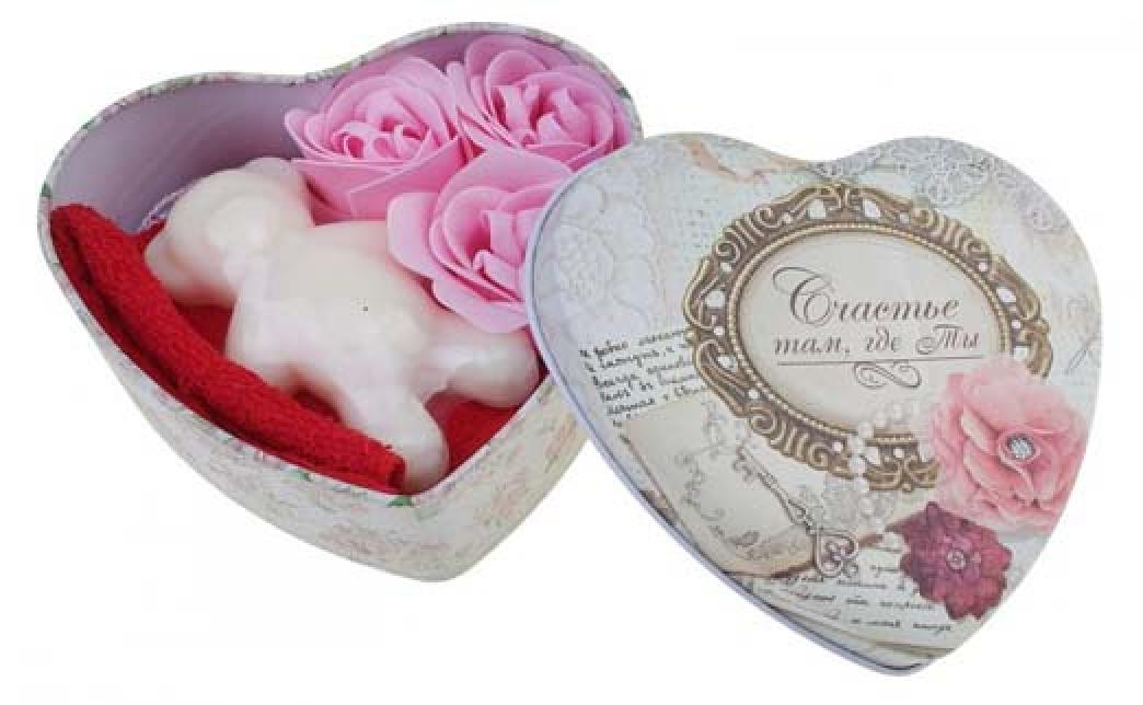 - набор "От всей души" (в шкатулке: мыло "сердце с розочками" + серпантин)