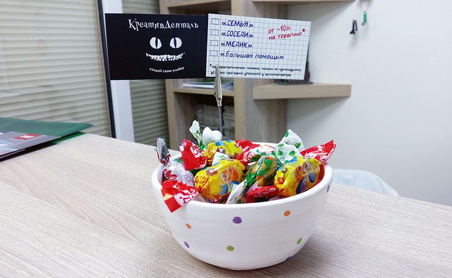 - В нашем кабинете действует система скидок на лечение зубов, подробности у администратора.