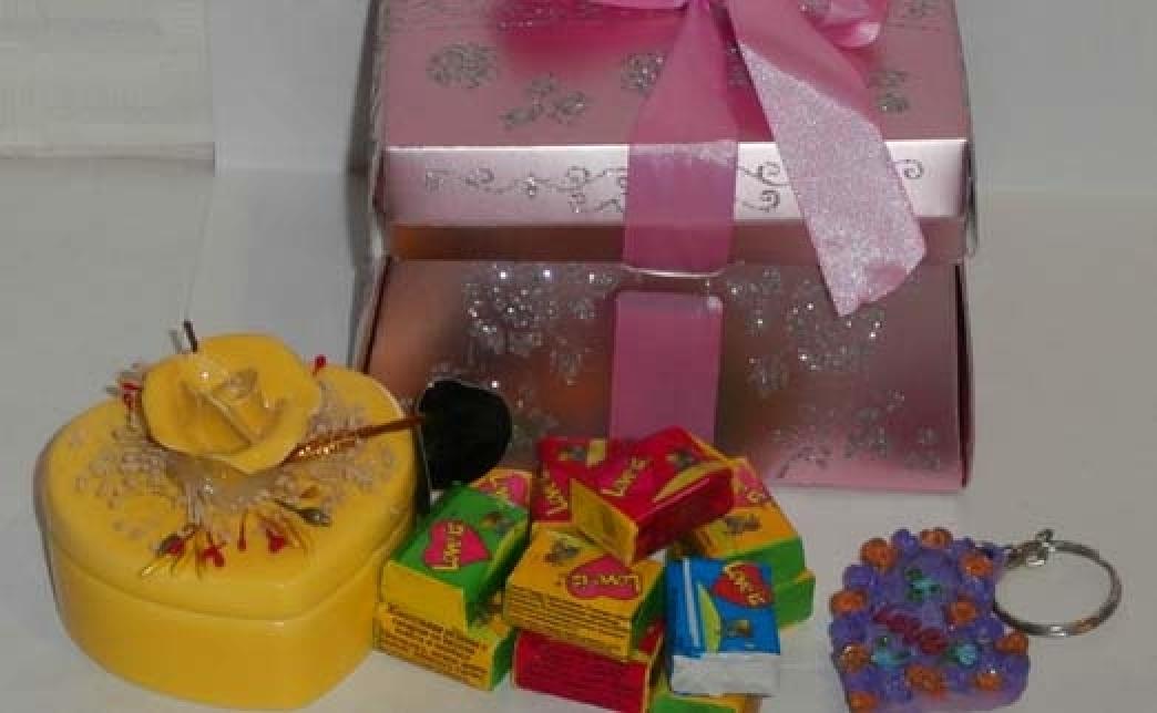 1. "Love is ..." 25 шт. жеват. резинок ассорти 2. Статуэтка на выбор 1 шт. 3. Брелок сердце керамика 1 шт. 4. Подарочная упаковка на выбор.