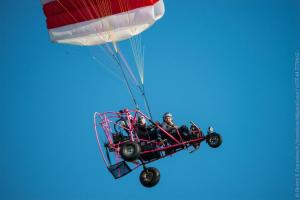Аэрошют - это тележка с мотором, винтом и парашютом. Грузоподъемность аппарата составляет 450 кг, это значит, что пилоту не грозит одиночество, аппарат поднимет в небо пассажира до 100 кг. Скорость полета невелика 50 км/ч, а высота - от "бреющего" в одном-двух метрах от земли до заоблачных. Продолжительность полета от 10 минут до 1 часа.