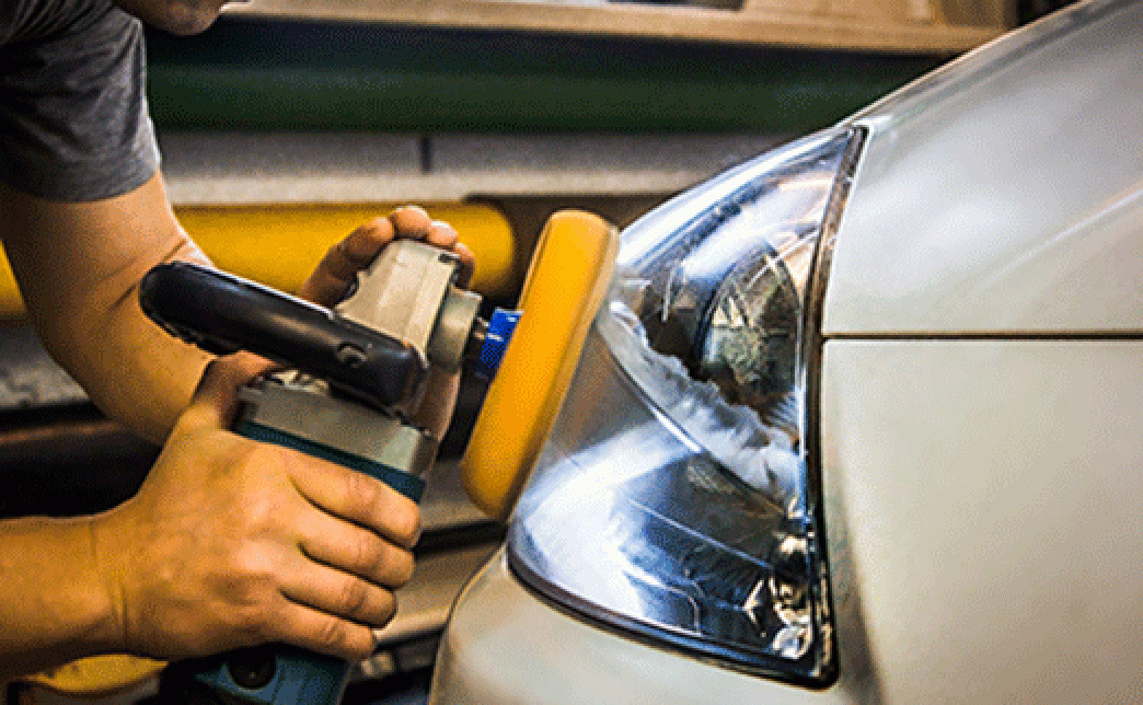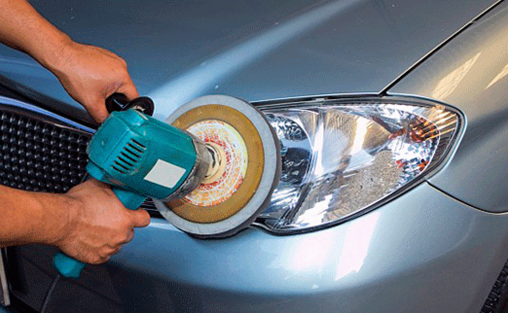 - шлифуем фары шлифмашиной специальными абразивными пастами до полного блеска фар.