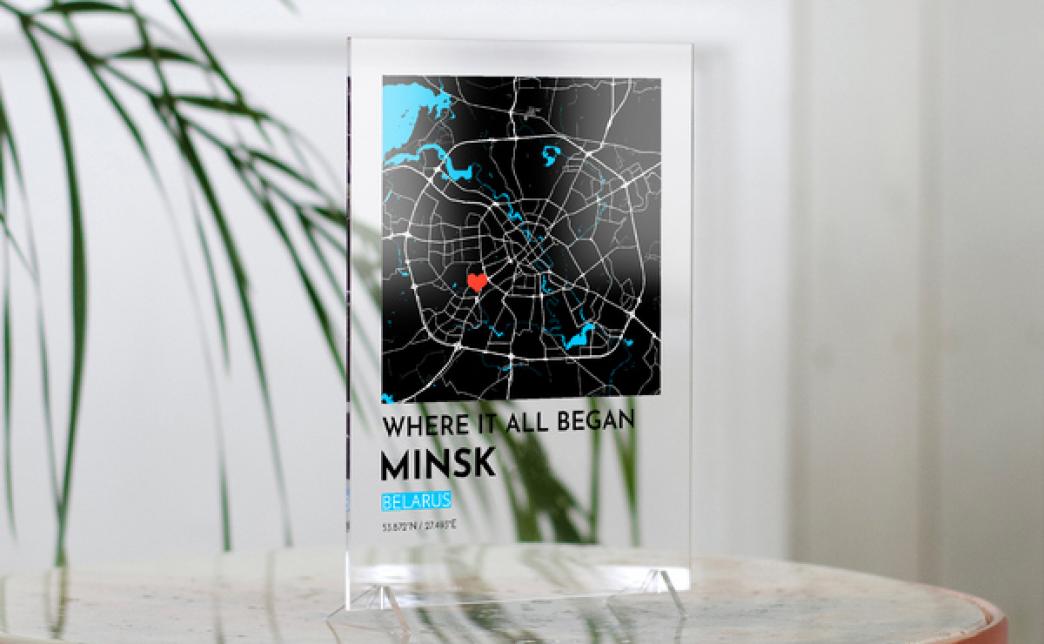 "Map Glass" - постер из прозрачного органического стекла с картой выбранной местности, отметкой на карте, надписью города, страны и координат.