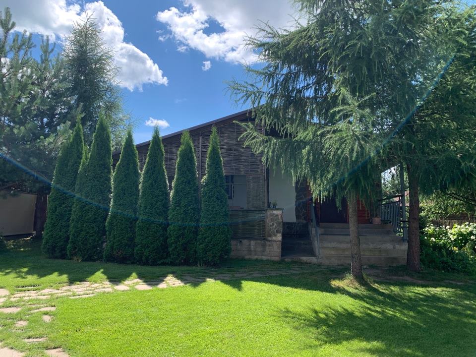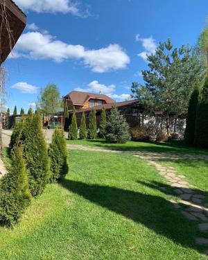 - высажено множество деревьев и кустарников, туй, очень зелено, имеется зарыбленный пруд
