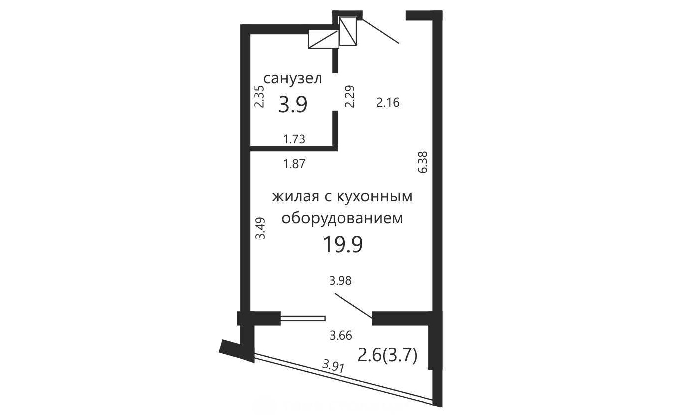 - Площадь по СНБ 26,4 м², общая площадь: 23,8 м², жилая площадь: 19,9 м², высота потолка: 2.75 м