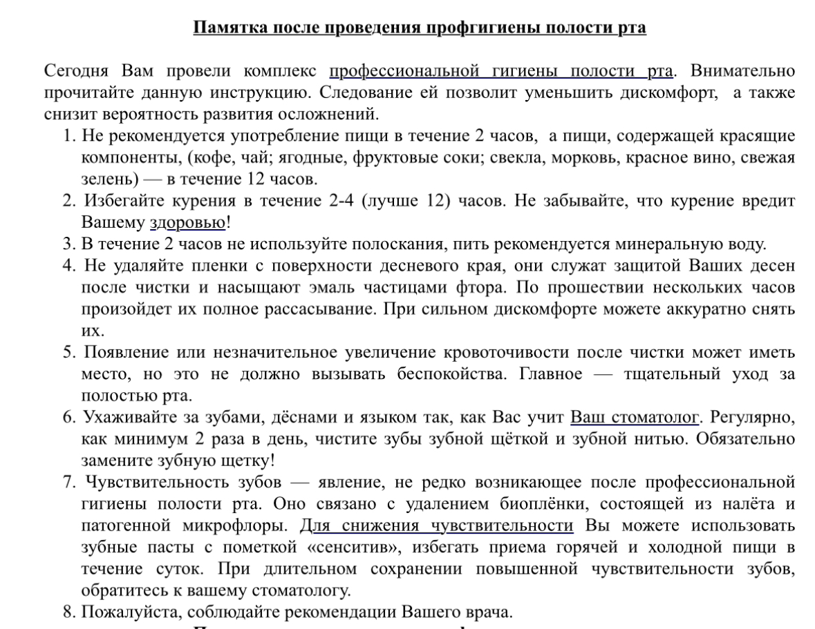 - полировка зубов профессиональной щеткой и пастой- покрытие зубов фторосодержащим препаратом