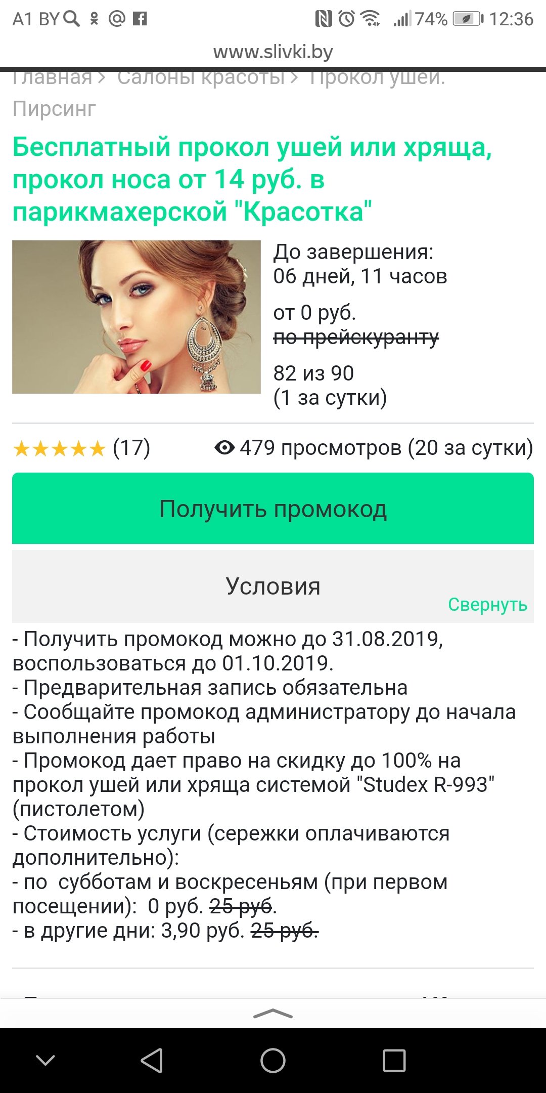 - Промокод также дает право на скидку 44% на классический прокол ушей или хряща (иголкой)