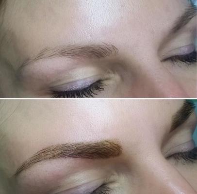 Окрашивание бровей производится краской (Refectocil, Elan, Bronsun) или хной на Ваш выбор. SPA-уход включает в себя: подготовку кожи перед окрашиванием (скрабирование, обезжиривание), нанесение разметки, закрепление результата укрепляющими маслами и гелем. Так же по желанию предоставляется услуга макияж бровей.
