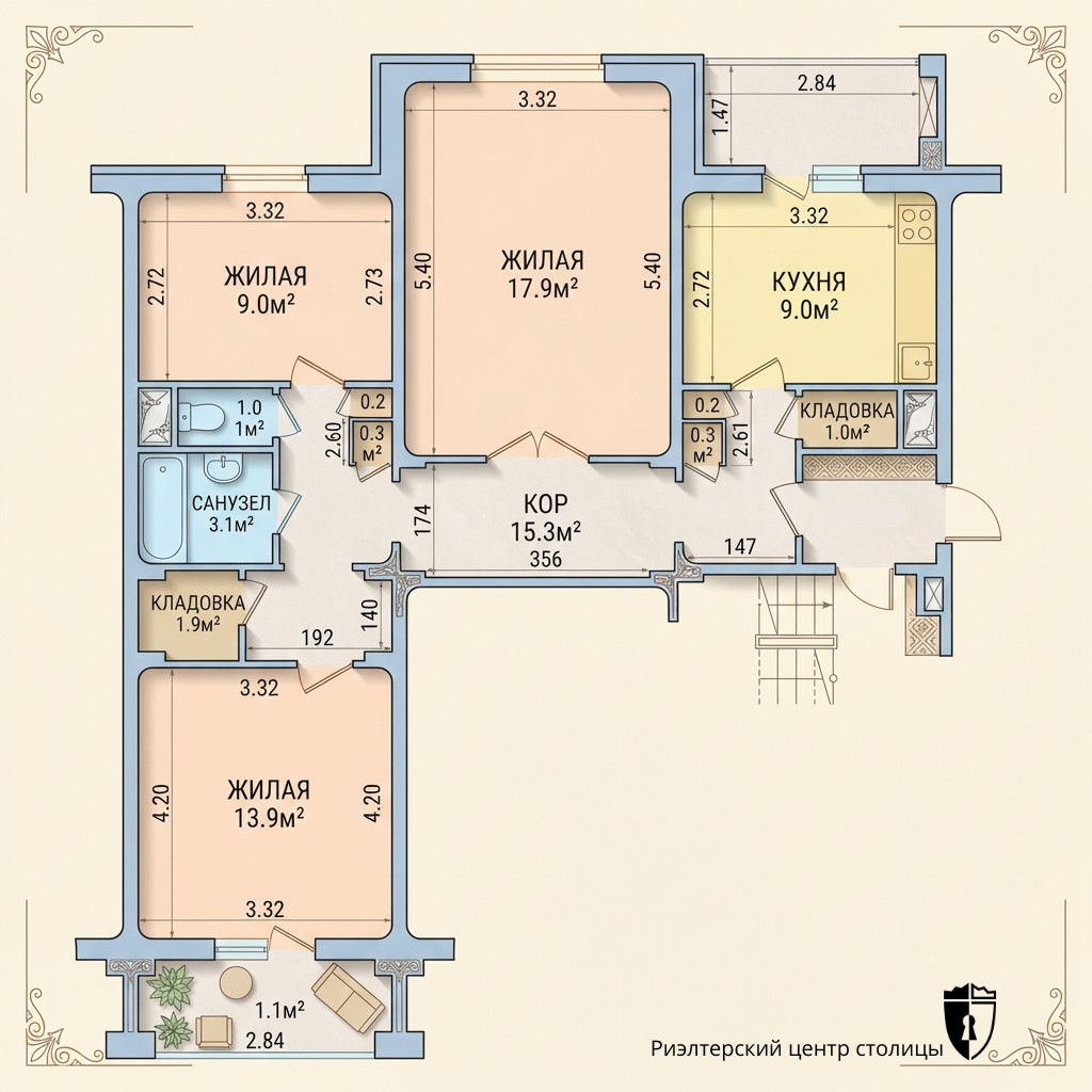 - Большая кухня 9 кв.м.: настоящее сердце дома, где легко собираться всей семьей за завтраком или ужином.