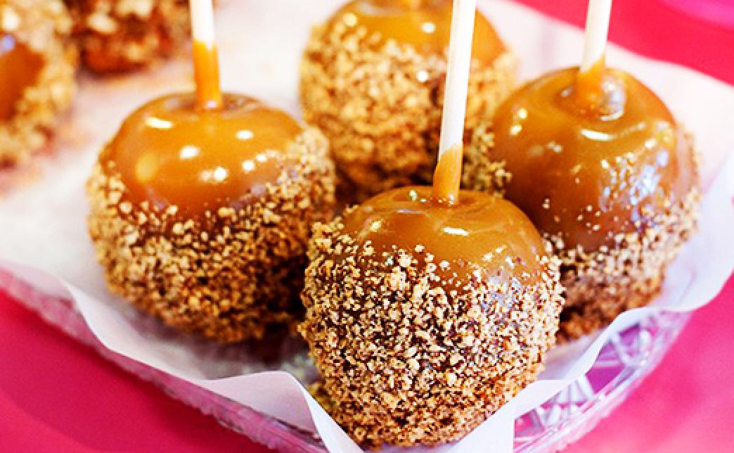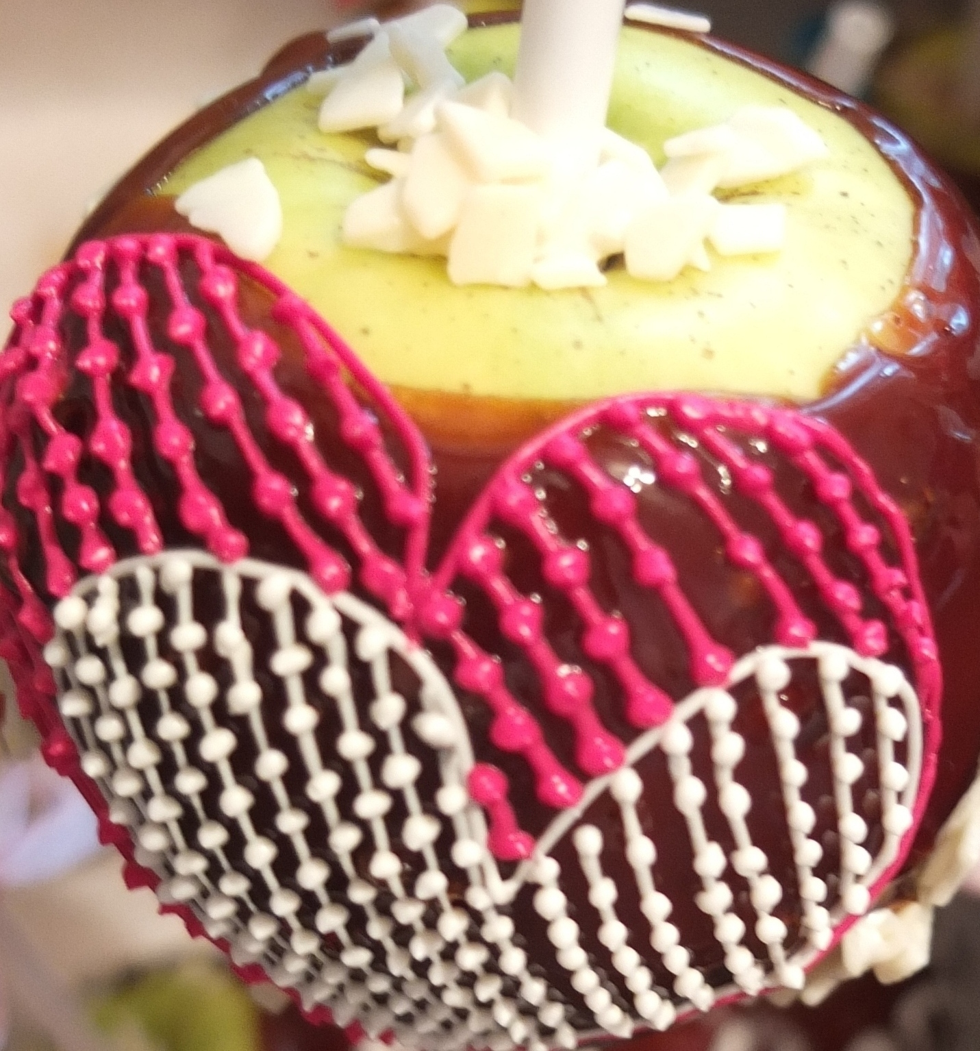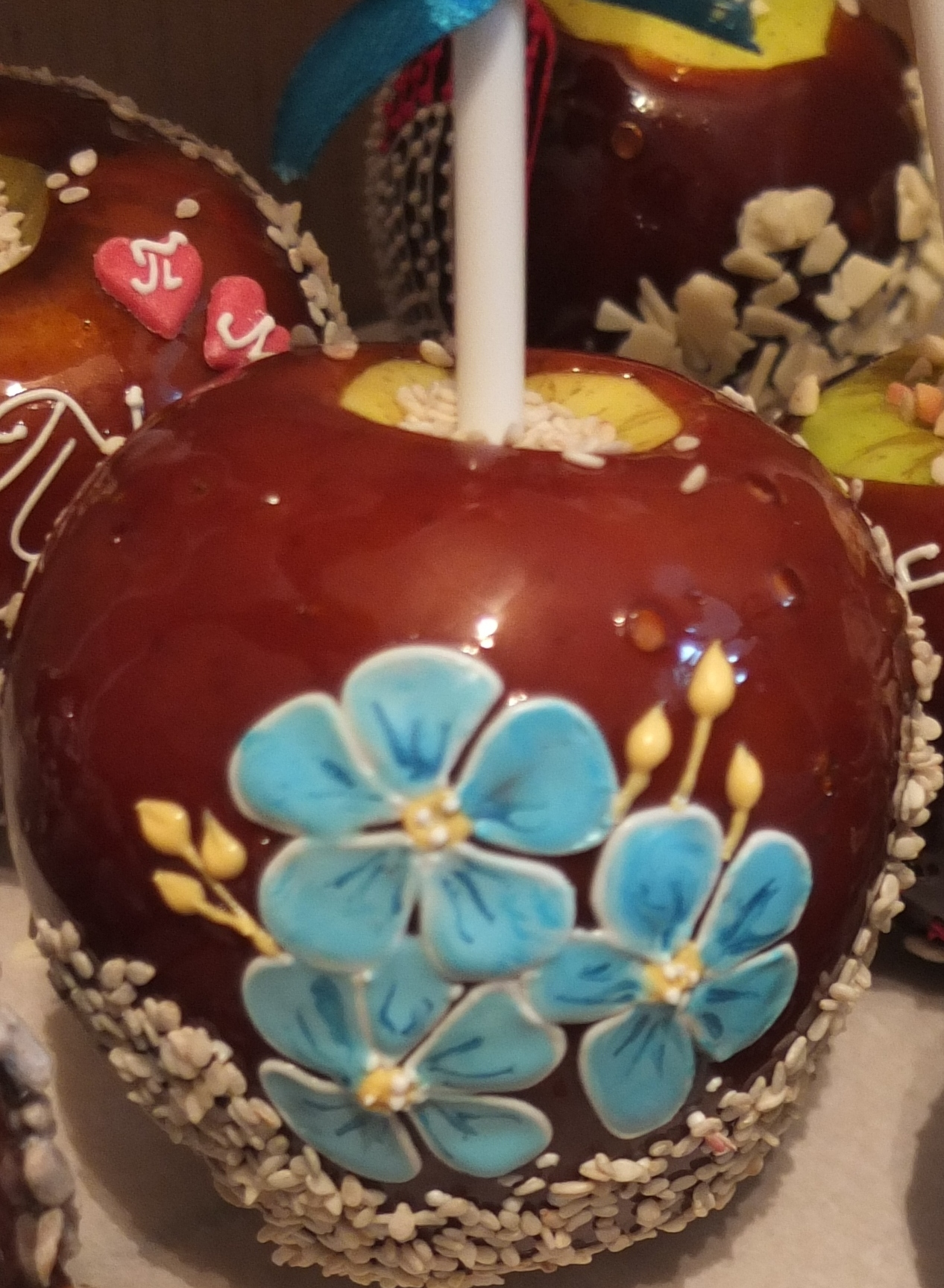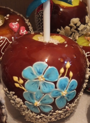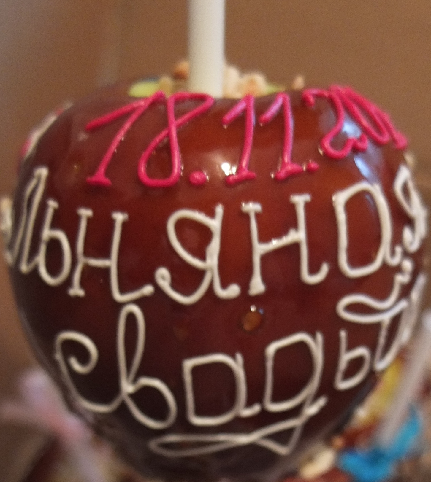 - яблоко в карамельной глазури с посыпкой (кунжут/кокос/посыпка вермишель (полевые цветы, шарики разноцветные) и ручной росписью сахарной глазурью (надписи, пожелания, картинки, логотипы и т.п.):