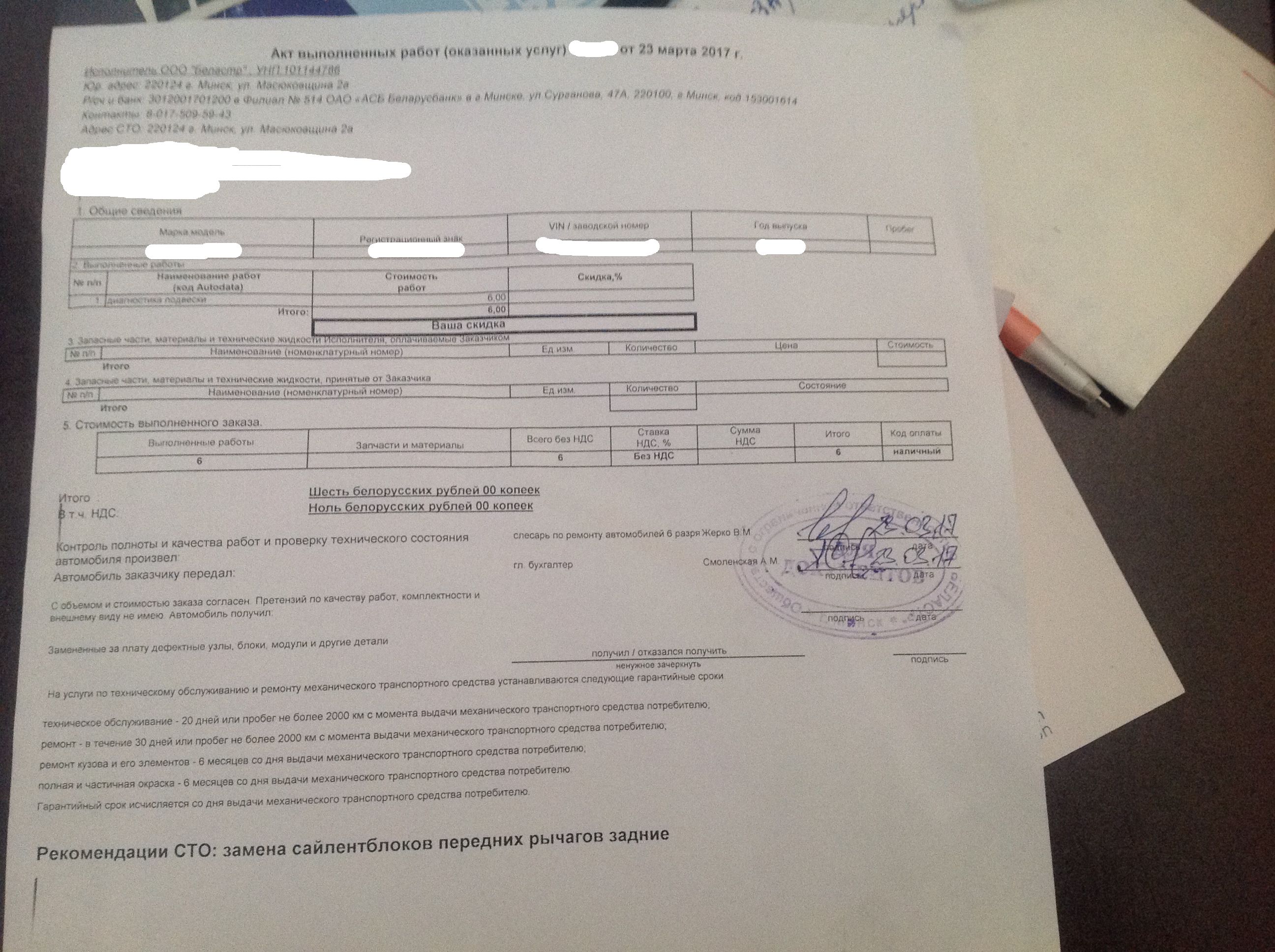 Приехал сделать развал-схождение передней оси т.к. менял рулевой наконечник. Составили заявление на выполнение работ, в котором указал ТОЛЬКО развал-схождение. В итоге мне сделали диагностику и сказали что неисправна шаровая и сальник и развал-схождение делать не будут, взяли за это 6 рублей. На другом СТО сказали что шаровая в порядке и сделали развал-схождение без проблем.