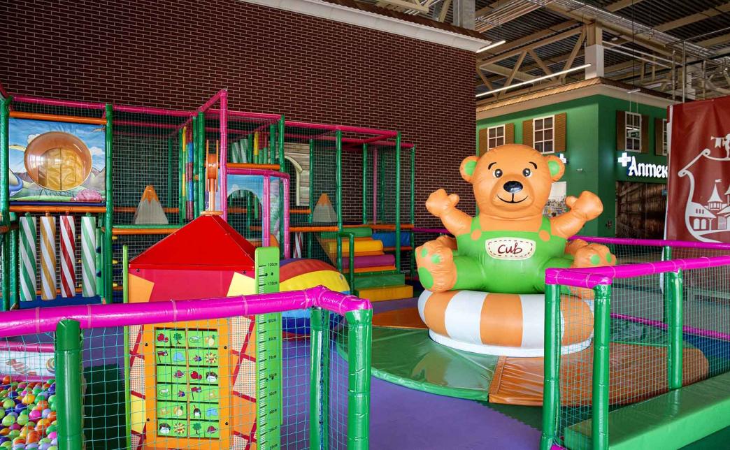 - игровая зона с горкой, шариковым бассейном и лабиринтом для малышей