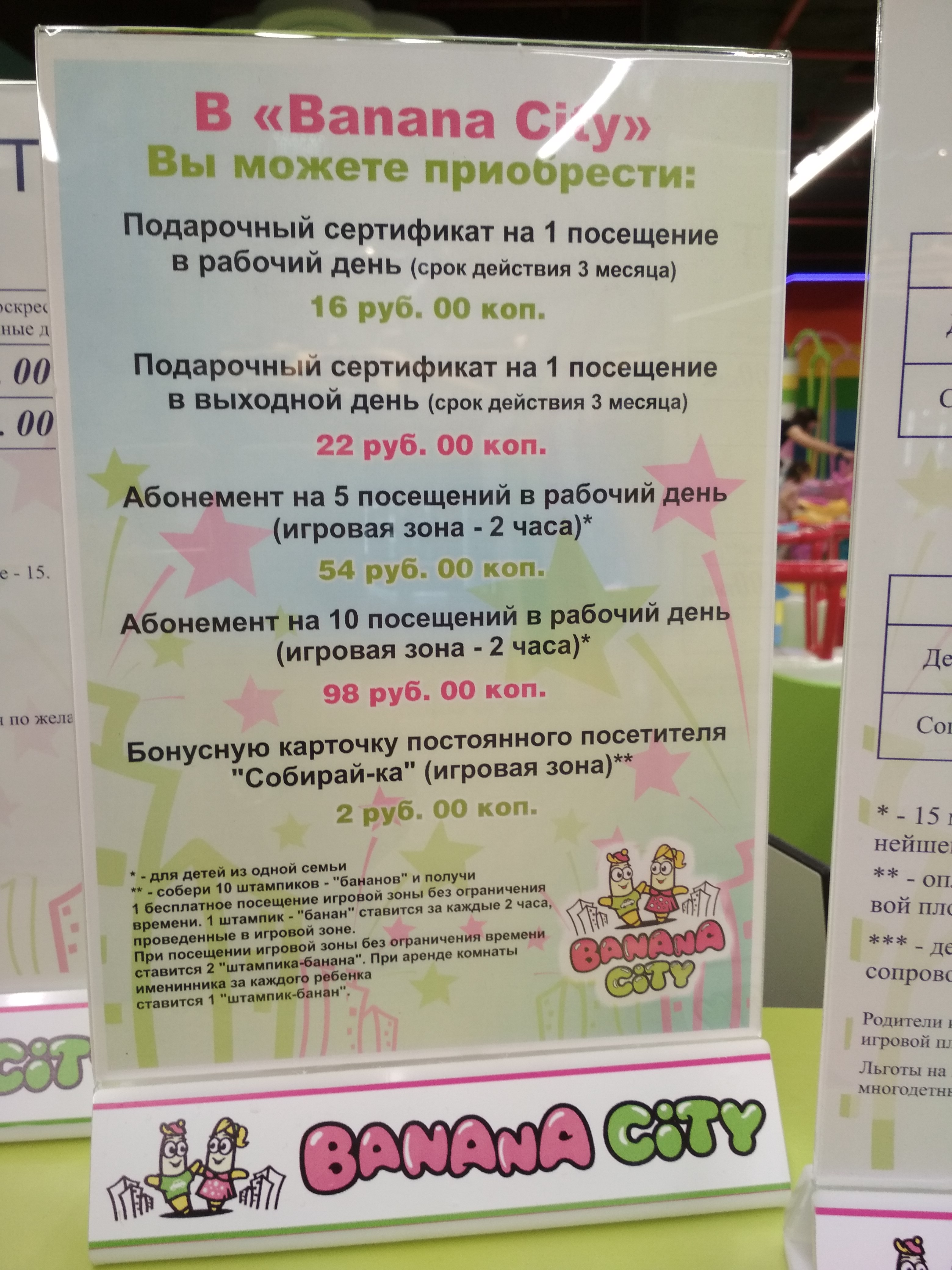 - Промокод дает право на скидку 50% на 2-часовое посещение детского развлекательного центра "Banana city" в ТРЦ "Palazzo"