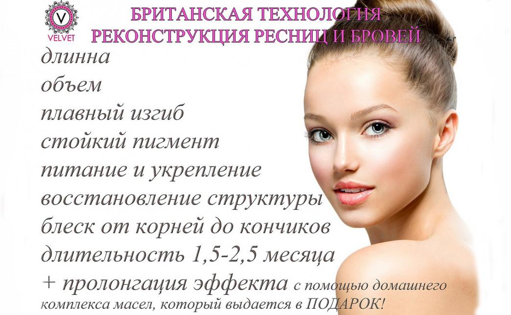 Реконструкция «Velvet for lashes&brows» (Великобритания) – это уникальная инновационная процедура для натуральных ресниц и бровей, по окончании которой достигается эстетическое преображение, активация луковиц, восстановление волосяных фолликул, стимуляция роста и удлинения волосков.