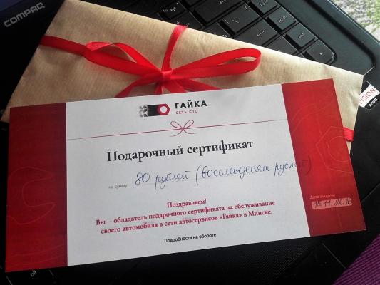 Купила другу на ДР сертификат от СТО "Гайка". Очень удобно: сначала думала просто деньги в конверте подарить, а потом решила: а почему бы не удвоить сумму. Заплатила 40 рублей, а подарила 80. Причем, работает сертификат аж полгода и рассчитываться им можно и за шиномонтаж, и за замену масла, и за любой ремонт. Я у них в Лошице уже два сезона переобуваюсь, ребята приветливые, все устраивает)