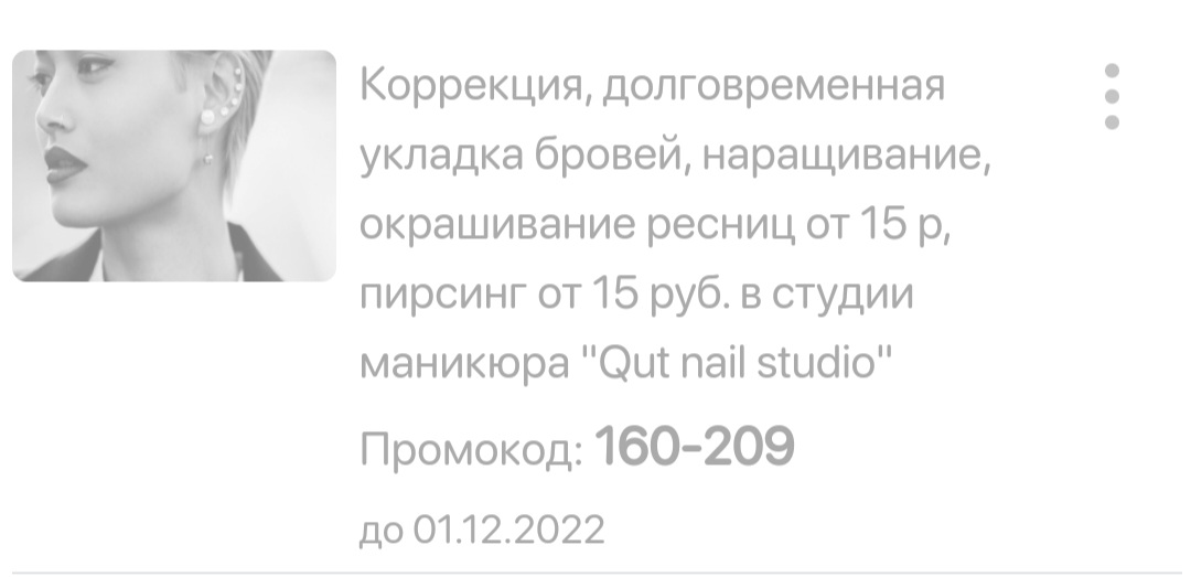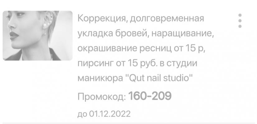 - Промокод дает право на скидку до 50% на коррекцию, моделирование, долговременную укладку бровей, наращивание, окрашивание ресниц, пирсинг и прокол ушей в студии маникюра "Qut nail studio"